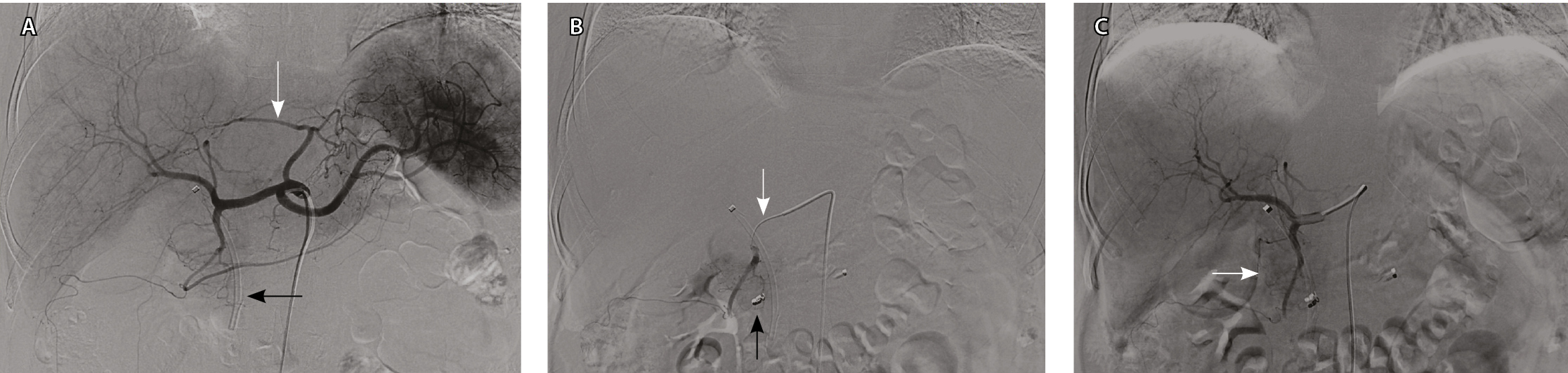Рис. 2. Ангиограммы пациентки Ш., 67 лет, диагноз: рак головки поджелудочной железы. Механическая желтуха купирована с помощью стентирования. А – при целиакографии отмечается один из вариантов сосудистой анатомии: замещающая левая печеночная артерия отходит от левой желудочной артерии (белая стрелка), правая и средняя – от общей печеночной артерии; пластиковый стент (черная стрелка) определяется в проекции холедоха. Б – катетер cobra 5 F установлен в общую печеночную артерию; коаксиально в правую желудочно-сальниковую артерию проведен микрокатетер 2,7 F, выполнена перераспределительная эмболизация металлической спиралью (черная стрелка); следующим этапом выполнена химиоэмболизация ветвей гастродуоденальной артерии, кровоснабжающих опухоль (белая стрелка). В – во время контрольной ангиографии из общей печеночной артерии отмечается накопление масляного препарата в опухоли (белая стрелка)