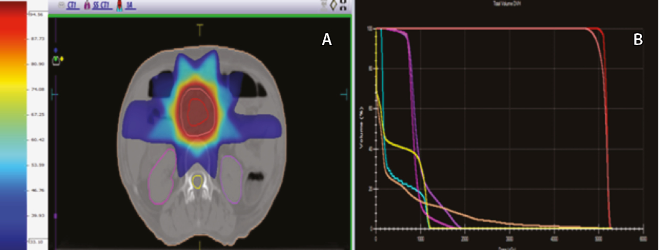 Допустимое облучение нормальных тканей соответствовало нормам Количественного анализа эффектов нормальных тканей в клинике (англ. Quantitative Analyses of Normal Tissue Effects in the Clinic, QUANTEC, 2010). В течение первых трех сеансов облучения и далее еженедельно осуществляли контроль погрешностей укладки с использованием методики объемной рентгеновской визуализации XVI (англ. X-ray Volume Imaging).