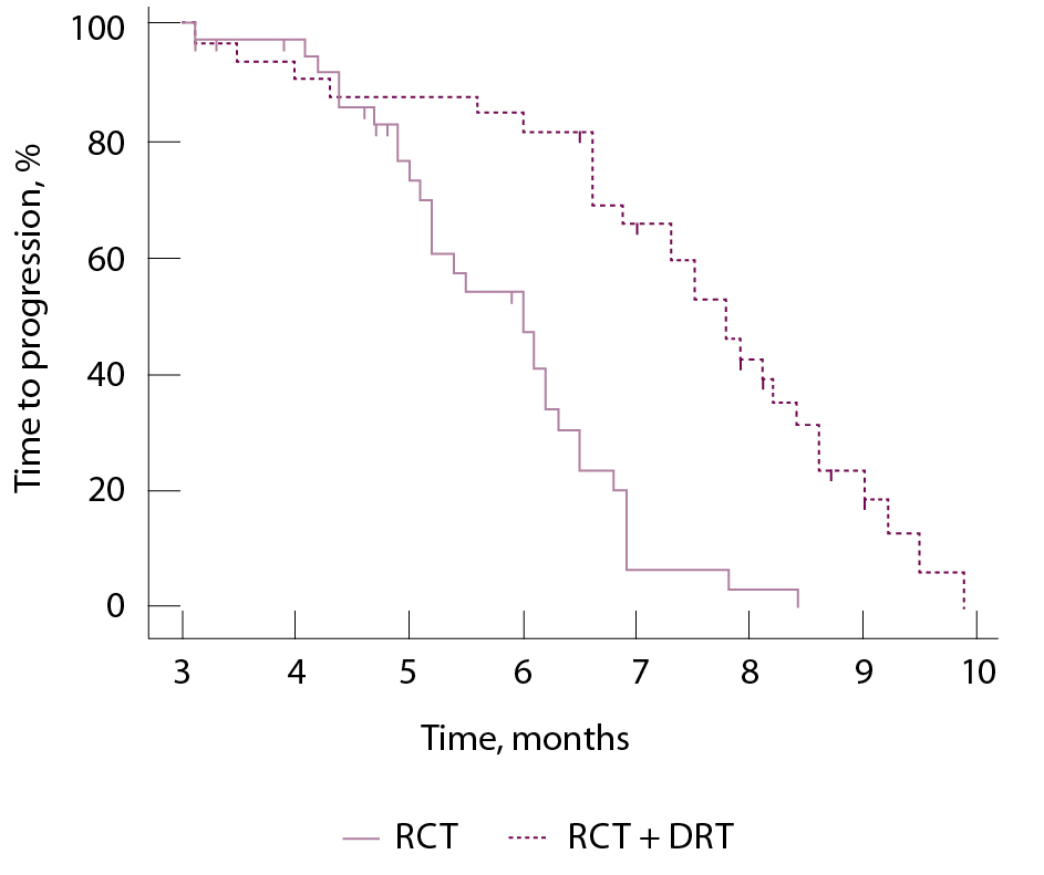 Рис. 4. Время до прогрессирования (метод Каплана – Мейера) в группах проведения регионарной химиотерапии в монорежиме (РХТ) и в комбинации с дистанционной лучевой терапией в режиме дневного дробления дозы (РХТ + ЛТ)