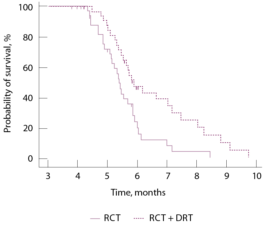 Данные литературы об эффективности химио-лучевой терапии при РПЖ неоднозначны, что объясняется прежде всего отсутствием общепринятого протокола ЛТ [9, 10]. Так, в рандомизированном исследовании ECOG E4201 получено значительное увеличение медианы общей выживаемости после химиолучевого лечения больных местнораспространенным РПЖ по сравнению с монотерапией гемцитабином (11,1 месяца против 9,2 месяца, p = 0,017), однако комбинированная терапия сопровождалась бо`льшим числом нежелательных явлений 4-й и 5-й степени (41% против 9%) [20]. Другое рандомизированное исследование III фазы LAP07, напротив, не показало существенной разницы в продолжительности жизни после химиолучевой терапии по сравнению с химиотерапией эрлотинибом и/или гемцитабином: медиана общей выживаемости составила 15,2 месяца против 16,5 месяца (p = 0,830). Комбинированное лечение сопровождалось снижением локорегионарного прогрессирования (32% против 46%, р = 0,03). Нежелательные явления не различались между группами, за исключением тошноты 3–4-й степени у 6 (5,9%) пациентов в группе химиолучевой терапии [21]. В нашей работе наилучший контроль первичной опухоли также был достигнут после РХТ и облучения по сравнению с РХТ в монорежиме: частота местного прогрессирования РПЖ была меньше почти в 3 раза (12% против 34%, р = 0,03). Соответственно, большинство пациентов в группе комбинированного лечения погибало от генерализации процесса.