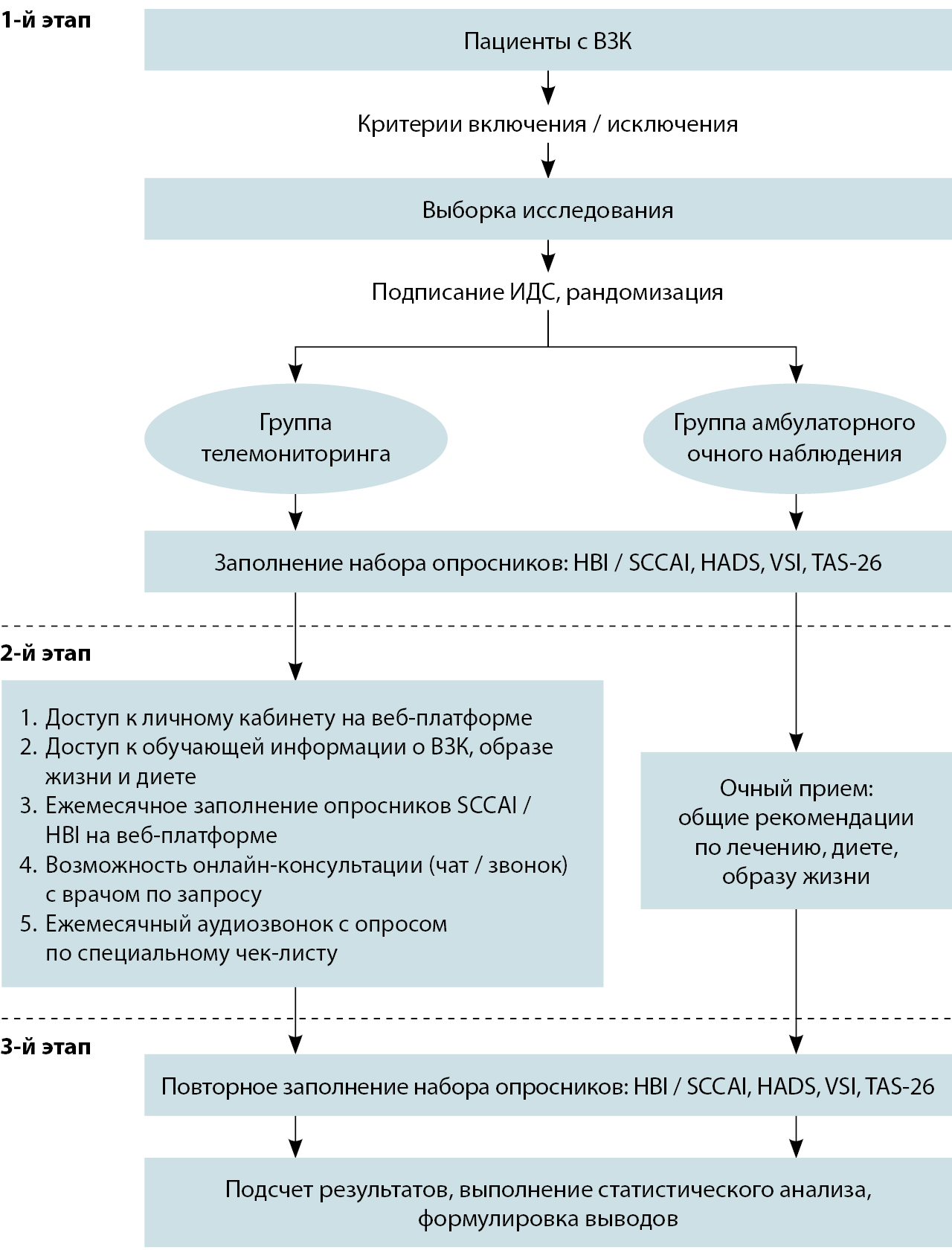 Критерии соответствия. В исследование включали пациентов старше 18 лет с диагностированным ВЗК, подписавших информированное добровольное согласие на участие в исследовании. Критерии невключения в исследование: беременность; когнитивные или сенсорные нарушения, препятствующие пониманию вопросов в опросах и инструментах исследования; отсутствие устройства для доступа к веб-платформе; участие в других клинических исследованиях; первичный диагноз психического заболевания; тяжелые сопутствующие заболевания. Из исследования исключали пациентов с диагностированными онкологическими заболеваниями, беременных, а также лиц, отказавшихся от участия на любом этапе исследования.