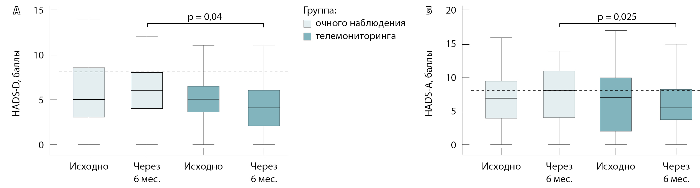 Рис. 4. Показатели депрессии (А) и тревоги (Б) опросника HADS в группах очного наблюдения и телемониторинга в момент включения в исследование (исходно) и через 6 месяцев наблюдения. Пунктирной линией указано пороговое значение для наличия тревоги и депрессии. HADS (Hospital Anxiety and Depression Scale) – Госпитальная шкала тревоги и депрессии, А – домен тревоги, D – домен депрессии