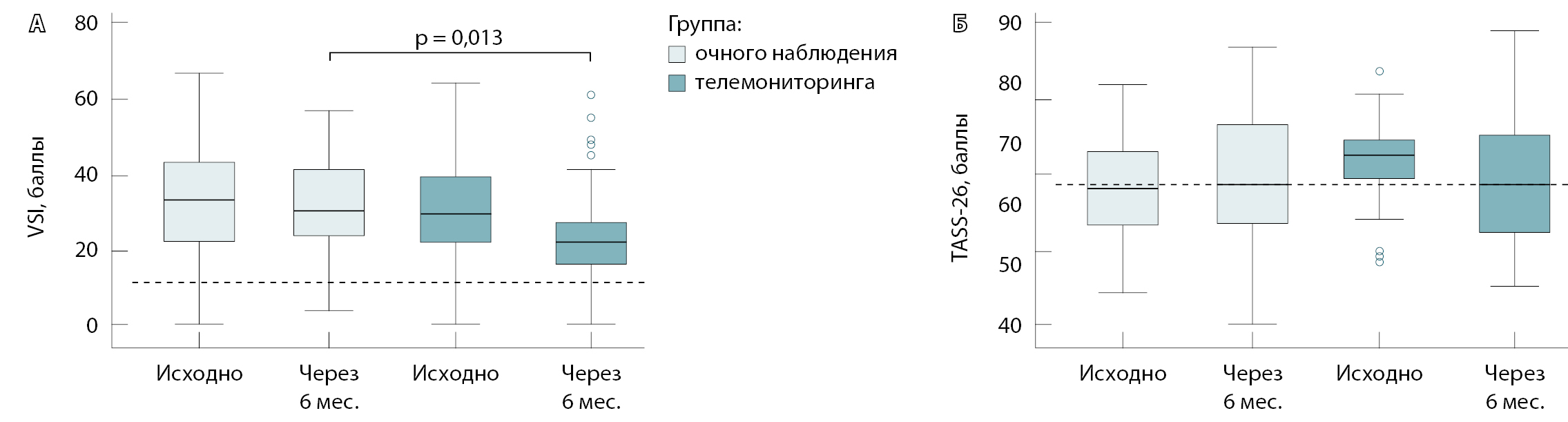 Рис. 5. Показатели индекса висцеральной чувствительности (А) и алекситимии (Б) в группах очного наблюдения и телемониторинга в момент включения в исследование (исходно) и через 6 месяцев наблюдения. Пунктирной линией указано пороговое значение для наличия висцеральной гиперчувствительности и алекситимии. TAS-26 (26-item Toronto Alexithymia Scale) – Торонтская шкала алекситимии, VSI (Visceral Sensitivity Index) – индекс висцеральной чувствительности
