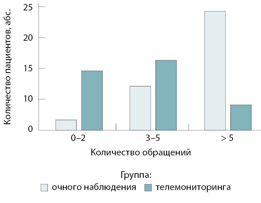 Рис. 6. Сравнение частоты обращений пациентов на амбулаторные консультации между группами очного наблюдения и телемониторинга