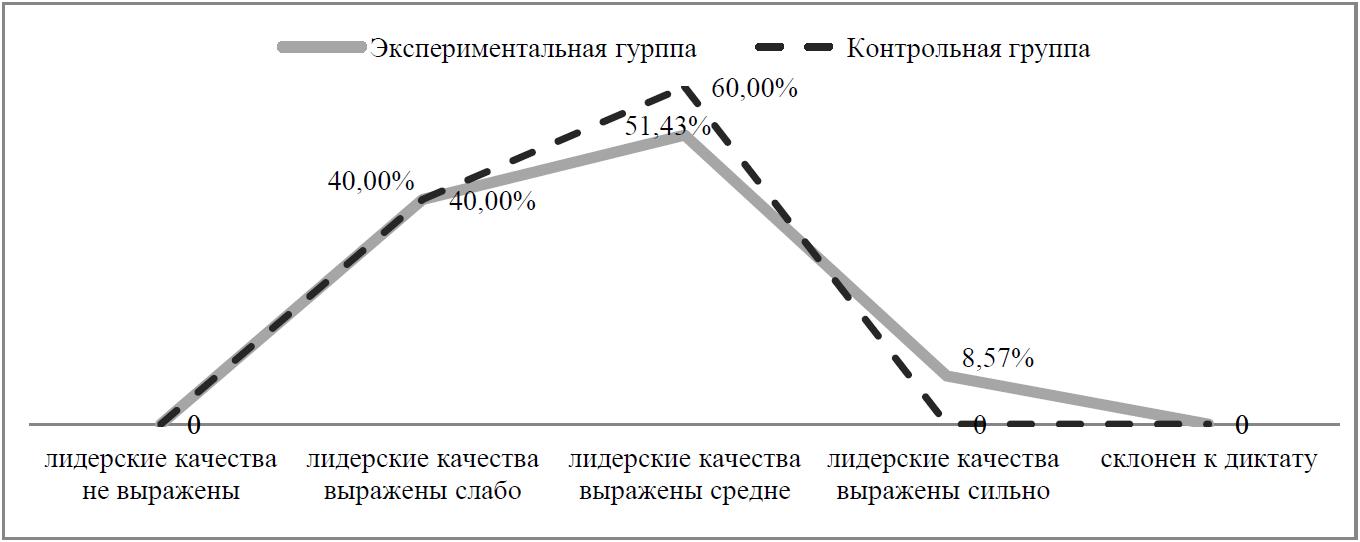 В экспериментальной группе у 8,57 % респондентов лидерские качества выражены на высоком уровне, у 51,43 % ‒ на среднем уровне. В контрольной группе отсутствовали студенты, показавшие высокий уровень сформированности лидерских качеств. В обеих группах нет участников, у которых лидерские качества не выражены или имеется склонность к диктату.