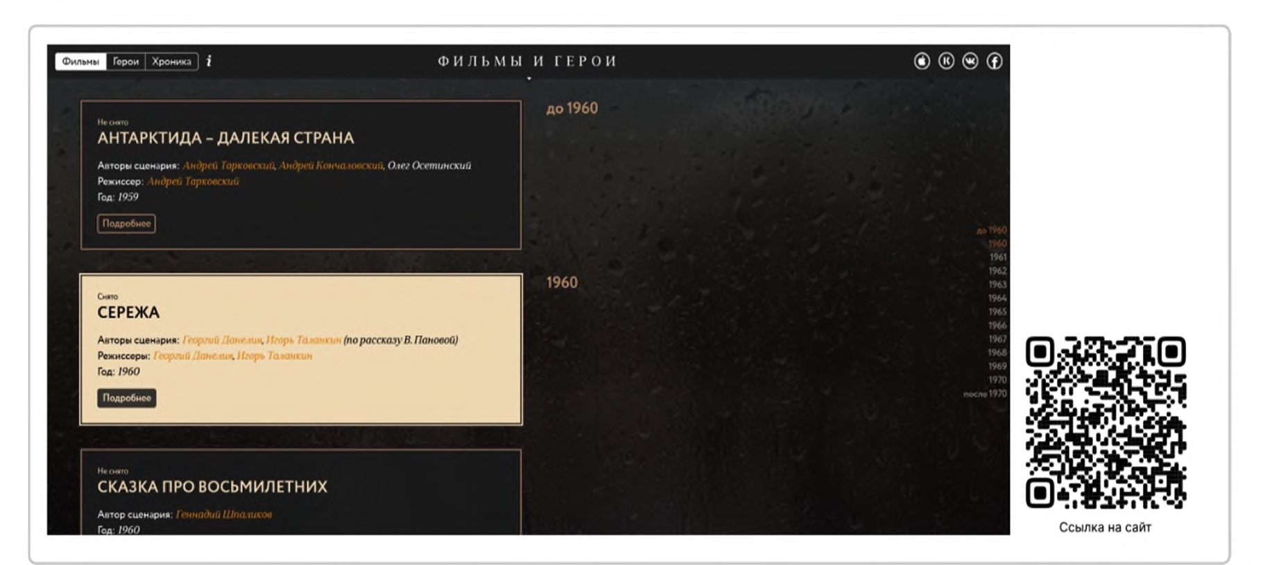 Четыре истории о неснятых фильмах – это верхушка айсберга. После линейных лонгридов навигационная логика ресурса подводит пользователя к масштабному лабиринту – энциклопедическому разделу «Фильмы и герои», где представлено описание 184 картин (Нестеров, рассказывая о проекте, говорил о 200 проработанных карточках [там же]). Светлым отмечены снятые кинокартины, черным – так и не вышедшие на экран.