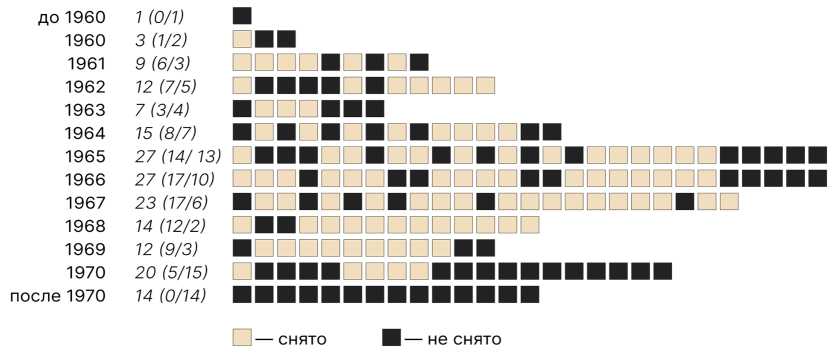 Три подраздела каталога («Фильмы», «Герои» и «Хроника») структурированы одинаково – вереница карточек с описанием ключевых, по мнению авторов проекта, фильмов эпохи, ее акторов, исторических отсечек в истории кинематографа 60-х. С данным разделом связан основной идейный конфликт: величие неснятого кино. Не случайно на первый стартовый экран сайта помещена цитата историка кино А. Фомина: «Осуществись эти замыслы – наше кино могло бы стать не просто лучше того, каким оно стало, но и вообще – другим» (Из жизни планет 2014). Выборка фильмов, хотя и осуществлялась при консультативной поддержке кинокритиков и исследователей кино (Н. Клейман, Е. Марголит и А. Фомин), все же сама по себе пристрастна: Нестеров соблюдает фактологическую основу, но состав подобранного материала обусловлен концепцией проекта. Чтобы убедиться в этом, достаточно взглянуть на соотношение карточек снятых и неснятых фильмов по годам (рис. 4).