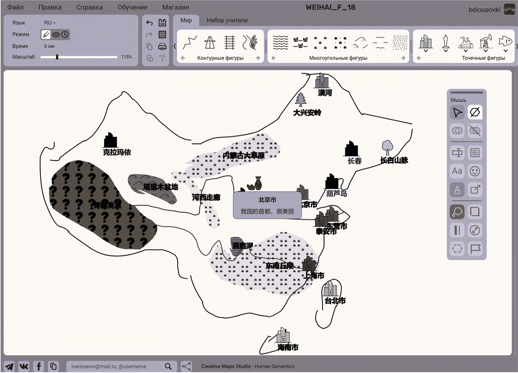 Перед информантом ставится задача на основании собственных знаний и представлений в веб-приложении «Студия креативных карт» нарисовать карту Китая, на которой нужно: