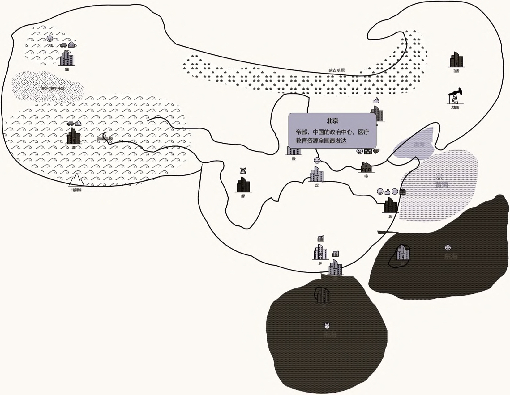 Информанты отметили два наиболее важных города Китая – Пекин и Шанхай. Из них самым значимым мегаполисом Китая является, конечно, Пекин, самый известный город Китая, его столица. На рис. 3 представлен скриншот ментальной карты Китая (Ии. Цинань_Ж_27 лет). Текстовый слой на самой карте можно увидеть при наведении курсора на географический объект.