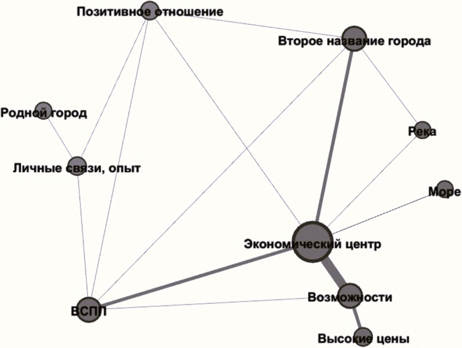 Граф включает в себя два кластера (обозначены разными цветами), меньший из них является периферийным, состоит из двух полей: «Древняя столица» и «Северные провинции». Поле «Древняя столица» располагается в отдельном кластере – в реакциях информантов указание на историю города редко сопровождается описанием современных реалий и достижений, скорее, указывается неизменность китайской истории: 北京从明朝开始就是中国的首都 [Пекин был столицей Китая со времен династии Мин].