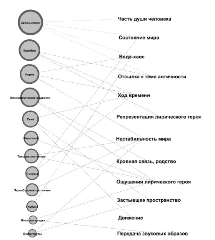 Функции, которые выполняют единицы тематической группы «вода», могут реализовываться единицами разных подгрупп. Больше всего связей с тематическими подгруппами обнаруживается у функций описания хода времени, изображения нестабильного состояния мира, представления воды как первородной стихии-хаоса, отображения чувств и ощущений лирического героя (см. рисунок). Например: нестабильность состояния мира репрезентуется через лексические единицы подгрупп «форма», «твердое состояние», «парообразное состояние», «озера/пруды»; ход времени – через лексемы подгрупп «корабли», «форма», «реки», «сосуды»; вода как стихия и хаос – через лексику подгрупп «океаны/моря», «форма», «глубина» и т. д.