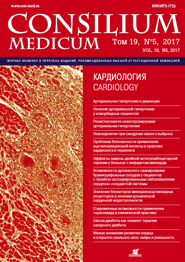 Актуальность. Оценка диастолических свойств миокарда левого желудочка (ЛЖ) у пациентов с гипертензивным сердцем актуальна в связи с тем, что они, формируясь на фоне увеличения массы миокарда ЛЖ, способны прогрессировать, манифестируя клиническим синдромом хронической сердечной недостаточности преимущественно в пожилом возрасте. Цель - определение эффективности периндоприла и ивабрадина в коррекции артериального давления и темпа сердечных сокращений, а также функциональных параметров миокарда ЛЖ, вазорегулирующей функции эндотелия периферических артерий у пациентов с гипертонической болезнью. Объект и методы. В исследование включены 43 мужчины в возрасте от 52 до 64 лет с диагнозом «гипертоническая болезнь» без систематического приема гипотензивных препаратов в прошлом, не имеющие клинических признаков хронической сердечной недостаточности, с синусовым ритмом в покое более 75 в минуту. Группу контроля составил 21 мужчина, сопоставимый по возрасту, без отклонений на электрокардиографии и физикальных признаков болезней сердца. Всем пациентам, включенным в исследование, проводилось эхокардиографическое обследование, с помощью которого определялись основные параметры в покое. Также использовались методы импульсноволновой допплерографии пути притока ЛЖ, а в режиме тканевой допплерографии оценивались скорость движения латеральной части кольца митрального клапана и индекс производительности миокарда ЛЖ. Проводилось нагрузочное тестирование на велоэргометре по 2 мин с мощностью 25, 50 и 75 Вт. Функция эндотелия и жесткость системных артерий оценивали методом пальцевой компьютерной фотоплетизмографии. Исследование было разделено на 3 визита: на 1-м пациентам назначался периндоприл (Престариум А, «Лаборатории Сервье», Франция) в дозе 10 мг/сут; на 2-м добавлялся ивабрадин (Кораксан, «Лаборатории Сервье», Франция) в дозе 7,5 мг 2 раза в день в течение месяца; 3-й визит был завершающим этапом исследования. Результаты. По данным измерения артериального давления на последнем визите группа больных с гипертонической болезнью не отличалась от контрольной по систолическому и диастолическому давлению лежа, сидя, при нагрузке 25 Вт. Добавление ивабрадина к периндоприлу усилило брадикардический эффект, значительно выровняв группу пациентов с контрольной по частоте сердечных сокращений во всем диапазоне физиологических состояний. Показатель функции эндотелия периферических артерий в ходе наблюдения полностью нормализовался. При исследовании индекса производительности миокарда ЛЖ нами показано, что совершение физической нагрузки и изменение положения тела способны значительно влиять в сторону его увеличения как у здоровых, так и у пациентов с гипертензивным сердцем. Заключение. Продемонстрированы существенный гипотензивный эффект периндоприла в покое, при динамической нагрузке и эффективность ивабрадина в нормализации темпа сердечных сокращений. Показаны высокая чувствительность фазового миокардиального индекса ЛЖ как маркера левожелудочковой дисфункции, динамические изменения индекса в ответ на нормализацию артериального давления и пульса независимо от массы миокарда ЛЖ, а также возможность нормализации сосудодвигательной функции сосудистого эндотелия периферических артерий, что создает основу для улучшени