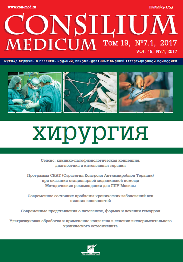 Остеомиелит остается сложной проблемой современной хирургии, несмотря на комплексные подходы к его профилактике и лечению, так как число инфекционных осложнений при переломах достигает 12%, а рецидивы заболевания - 30%. В статье представлена экспериментальная работа, целью которой явилось исследование новых подходов к лечению хронического остеомиелита, основанных на применении ультразвуковой обработки и коллагена. Исследование проведено на 210 белых крысах в 5 группах: в 1-й контрольной группе лечение хронического остеомиелита не проводили, во 2-й контрольной группе выполнялась хирургическая санация очага, в 1-й опытной группе применяли хирургическую санацию с ультразвуковой обработкой, во 2-й опытной группе после хирургической санации вносили коллаген, в 3-й опытной группе выполняли ультразвуковую обработку совместно с коллагеном. Разработанный комплексный метод лечения хронического остеомиелита, основанный на применении ультразвуковой обработки и коллагена, к 120-м суткам позволяет нормализовать общее состояние животных, сократить сроки заживления дефектов. Показатели клинического анализа крови нормализуются, наблюдается сбалансированность окислительного стресса, показатели минерального обмена свидетельствуют об активном процессе резорбции костной структуры и в последующем ее остеогенезе. В результате рентгенологического исследования выявлено уменьшение зон остеопороза и остеосклероза, прослеживаются четкие границы кортикального слоя, отсутствуют секвестры, и дефекты заполняются новообразованной костной тканью. При морфологическом исследовании наблюдаются ускорение синтеза коллагена, образование грануляционной ткани, улучшение микроциркуляции, происходит рассасывание инфильтрации. Морфометрические результаты исследования свидетельствуют о возрастании обособленности кости и предотвращении рарефикации костных структур.
