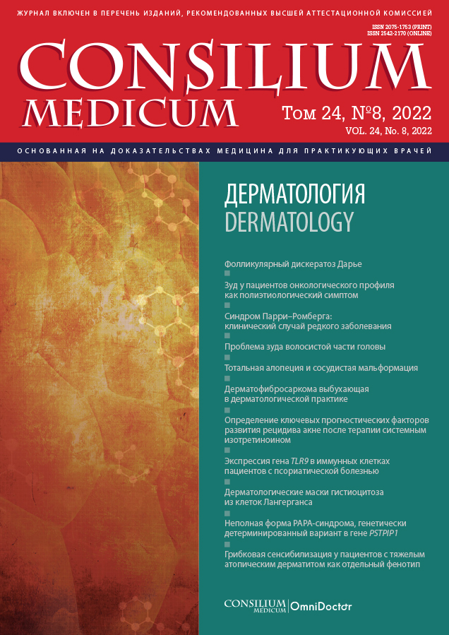 Синдром стерильного гнойного артрита, гангренозной пиодермии и акне, или PAPA-синдром (Pyogenic sterile arthritis, pyoderma gangrenosum, and acne syndrome), – редкое заболевание даже среди нечасто встречающихся системных аутовоспалительных заболеваний. Причиной заболевания являются мутации в гене PSTPIP1 (пролин-серин-треонин-фосфатаз-взаимодействующий белок 1). О функции PSTPIP1 известно мало, предположительно, гиперфосфорилированный мутантный белок сильнее связывается с пирином, что приводит к гиперпродукции интерлейкина-1. Цель – описать клинический случай синдрома PAPA у женщины 35 лет и дать современные представления об этом заболевании по данным научных публикаций. В отечественной литературе мы не встретили публикаций по PAPA-синдрому, подтвержденному генетическим анализом. У пациентки в подростковом возрасте появился артрит с поражением коленных и лучезапястных суставов, в возрасте 22 лет – трещины на пальцах рук, а с 33 лет – язвы с подрытыми краями на ладонях, пальцах рук и стойкое акне на лице и спине. Другие проявления включали гастроинтестинальные симптомы, общую слабость, головокружение. Проведена дифференциальная диагностика с аллергическими, гастроинтестинальными, аутоиммунными, эндокринными и дерматологическими заболеваниями, исключен синдром активации тучных клеток. По данным полноэкзомного секвенирования выявлена PSTPIP1-мутация A230T. Редкость и фенотипическая гетерогенность, связанные с синдромом PAPA, делают постановку диагноза сложной для врачей, особенно у взрослых пациентов. Поскольку у большинства пациентов не проявляется полный спектр классической триады, генетическое исследование имеет решающее значение для диагностики.