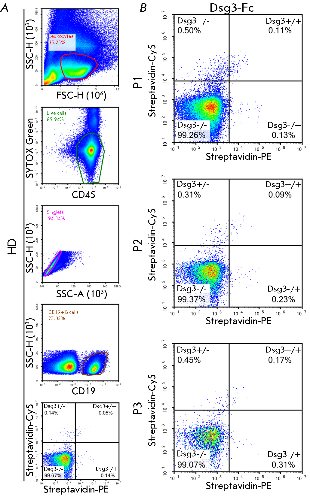 The number of B cells autoreactive to desmoglein was determined in the venous blood of patients diagnosed with pemphigus vulgaris (P1–P3); blood from a healthy donor (HD) was used as a control sample. Mononuclear cells were isolated from all the samples to further perform staining and a flow cytometry assay (Fig. 1).