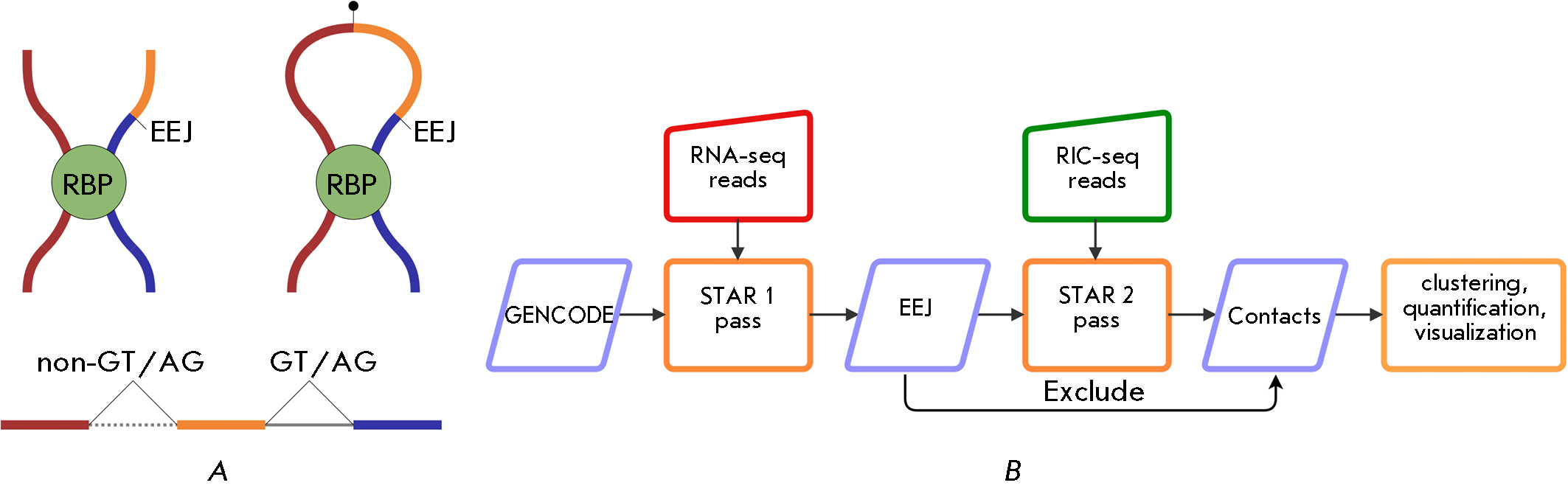 Fig. 1. (A) – In RIC-seq protocol [14], an unspliced RNA strand can be cross-linked through an RNA-binding protein (RBP) to a strand with exon-exon junctions (EEJ). The sequence formed by proximity ligation aligns to the reference genome with a non-GT/AG split reflecting the ligation point and a canonical GT/AG split resulting from splicing. (B) – The RNAcontacts pipeline. On the first pass, short reads from the control RNA-seq experiment are aligned to the reference genome to identify the expressed splice junctions. The latter are used on the second pass as bona fide introns when aligning proximity ligation data to detect ligation junctions, which encode RNA–RNA contacts