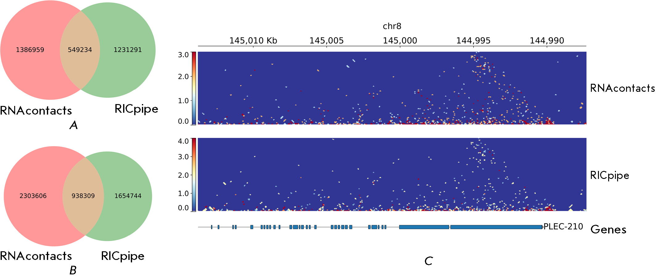Fig. 2. RNAcontacts vs. RICpipe. (A) – Venn diagram of ligation junctions obtained by RNAcontacts and RICpipe.(B) – Same as A, but weighted by read support. (C) – Contact maps for the PLEC-210 gene obtained by RNAcontacts (top) and RICpipe (bottom)