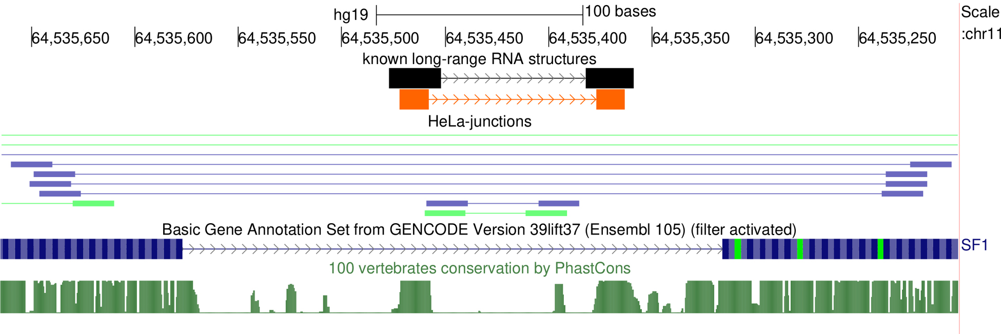 Fig. 3. Ligation junctions supporting the RNA structure in the human SF1 gene [28]. The complementary strands are shown in orange. Ligation junctions in the HeLa cell line are shown under the HeLa junctions track. The reads from the two bioreplicates are shown in blue and green