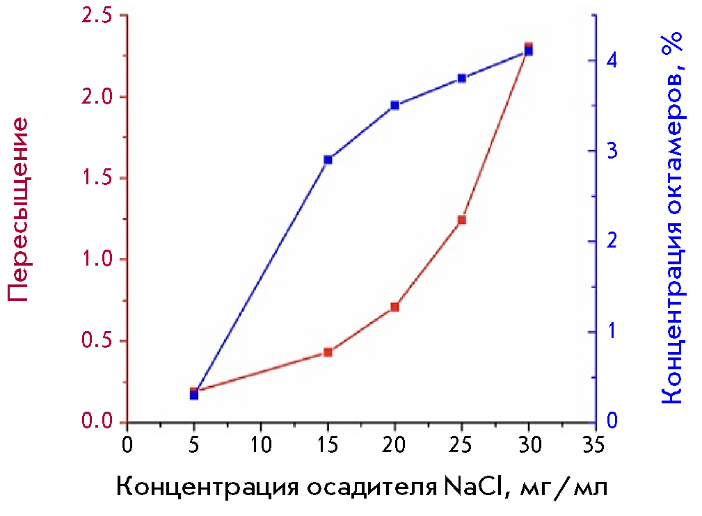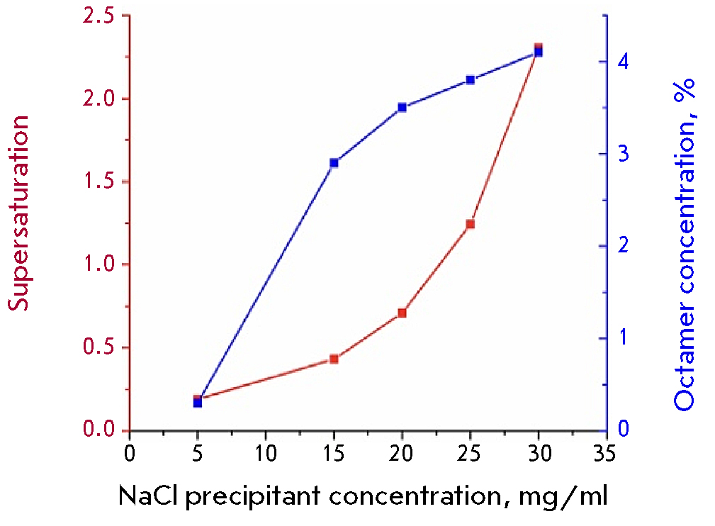 The volume fraction of octamers in the solution increases from 2.9 to 4.1% with an increase in the NaCl concentration (from 15 to 30 mg/ml). At the same time, an increase in the precipitant concentration leads to a rapid rise in the supersaturation degree, which indicates the instability of this state, when even a slight change in the environment can significantly affect the solution supersaturation degree. In other words, in the region where the volume fraction of octamers exceeds 4%, the probability of aggregation and occurrence of crystals would decrease, while the probability of aggregation and formation of an amorphous precipitate, on the contrary, should increase.