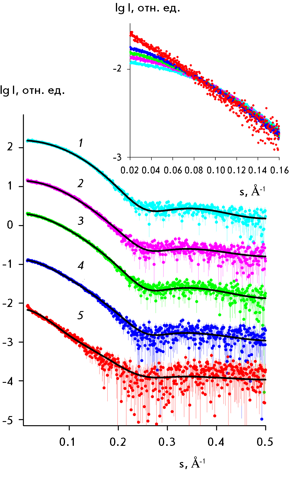 3. Fig. 2. Experimental SAXS curves (colored lines) for lysozyme crystallization solutions (black lines) and theoretical approximations using a mixture of oligomers calculated using the OLIGOMER program for the following solutions: 1 – lysozyme with CS1 18 precipitant (monomers only, no crystal), 2 – lysozyme with CS1 17 precipitant (dimers and monomers, no crystal), 3 – lysozyme with CS1 31 precipitant (monomers, dimers, octamers, and crystal), 4 – lysozyme with CS1 31 precipitant (monomers, dimers, octamers, and aggregation), 5 – lysozyme with CS1 45 precipitant (monomers, dimers octamers, and denaturation). The curves are shifted along the vertical axis for better visualization