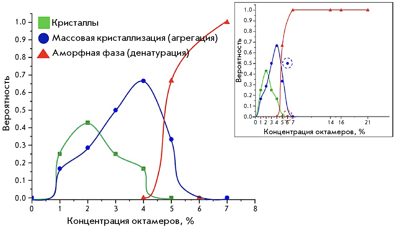 Fig. 3. General patterns of the changes in the probability of lysozyme crystal growth, aggregation, and denaturation as a function of the integer fraction of octamers (21% magnification of the interval of the volume fraction of octamers in the inset), for different cases of condensed phase formation: crystals (green line), mass crystallization (blue line), and amorphous precipitate/denaturation (red line)