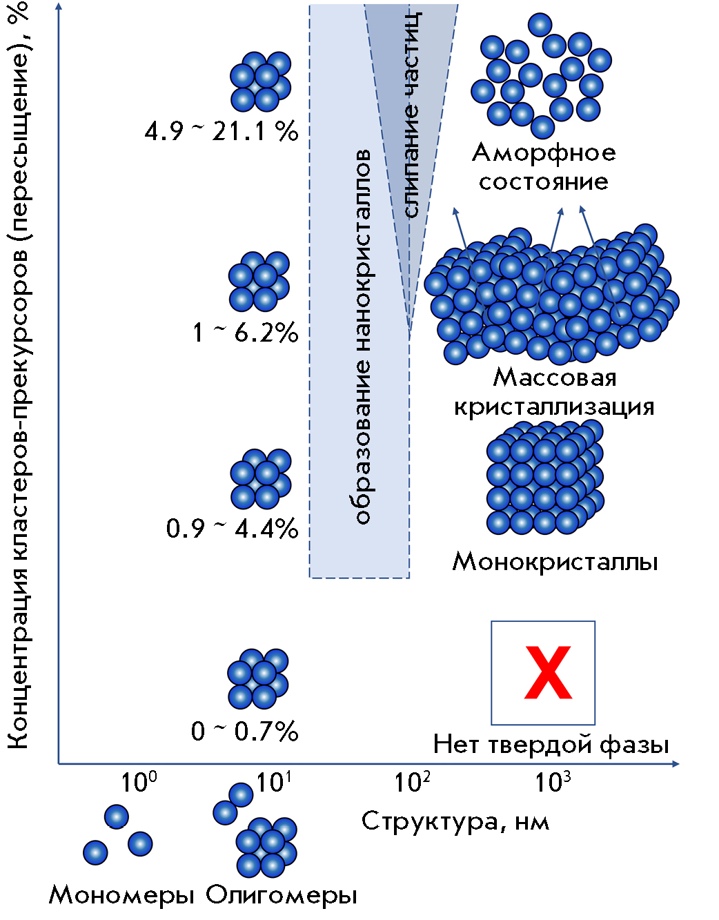 • at an octamer concentration in the range of 0.7–4%, either individual crystals form or mass crystallization (aggregation) takes place, with the aggregation probability increasing with increasing precursor cluster concentration (solution supersaturation degree); and