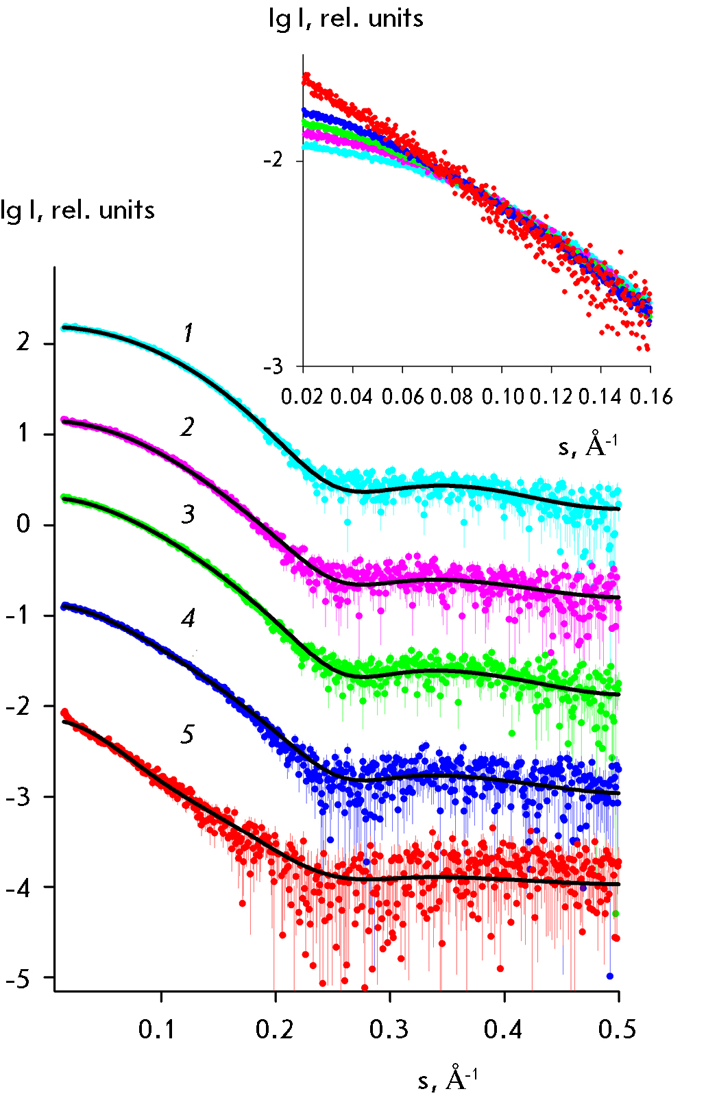 Fig. 2. Experimental SAXS curves (colored lines) for lysozyme crystallization solutions (black lines) and theoretical approximations using a mixture of oligomers calculated using the OLIGOMER program for the following solutions: 1 – lysozyme with CS1 18 precipitant (monomers only, no crystal), 2 – lysozyme with CS1 17 precipitant (dimers and monomers, no crystal), 3 – lysozyme with CS1 31 precipitant (monomers, dimers, octamers, and crystal), 4 – lysozyme with CS1 31 precipitant (monomers, dimers, octamers, and aggregation), 5 – lysozyme with CS1 45 precipitant (monomers, dimers octamers, and denaturation). The curves are shifted along the vertical axis for better visualization