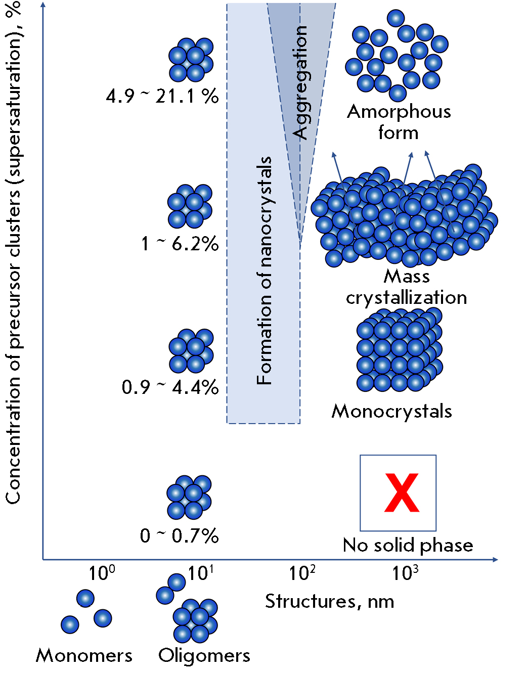 3) the degree of solution supersaturation becomes so high that the precursor cluster concentration increases to the point where aggregation takes place (the state that can further evolve into a crystal); and