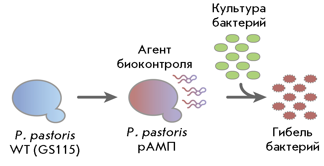 2. Рис. 1. Схематическое представление генетического программирования штаммов дрожжей P. pastoris и создания рекомбинантного агента биоконтроля. Клетки дрожжей дикого типа (P. pastoris WT GS115) трансфицируют генетической конструкцией для продукции секретируемой АМП; кокультивирование полученного агента биоконтроля (P. pastoris рАМП) с бактерией-мишенью приводит к гибели этой бактерии