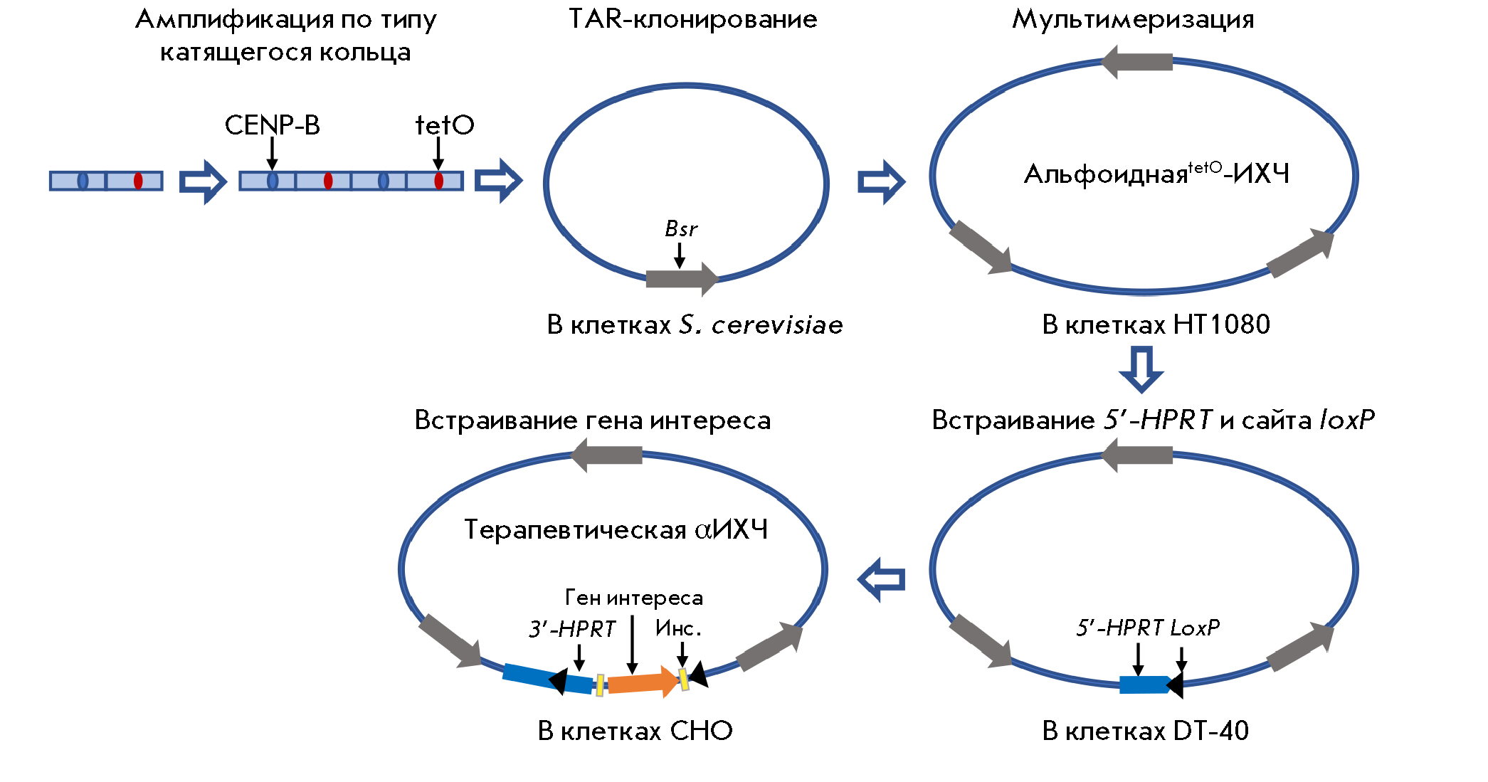 Рис. 3. Схема сборки альфоиднойtetO-ИХЧ. На первом этапе синтезируют димер, состоящий из двух единиц, одна из которых представляет собой альфа-сателлитный повтор из центромерного участка 17-й хромосомы человека, длиной 170 п.н., содержащий CENP-B-бокс (синий овал), а вторая – такой же повтор, у которого CENP-B-бокс заменен на тетрациклиновый оператор (tetO – красный овал). После амплификации такого димера по методу катящегося кольца образуется фрагмент длиной до 10 т.п.н. Затем в дрожжевых клетках осуществляется TAR-клонирование полученных фрагментов, в результате чего образуется кольцевая конструкция размером около 50 т.п.н., содержащая ген устойчивости к бластицидину (Bsr, серая стрелка). Мультимеризация кольцевой конструкции происходит в клетках линии НТ1080, в результате чего образуется альфоиднаяtetO-ИХЧ размером 1.1 млн п.н. Встраивание сайта loxP в ИХЧ происходит после слияния клеток НТ1080 с клетками DT-40 (черная стрелка). АльфоиднуюtetO-ИХЧ переносят в клетки линии СНО, в которых производят «загрузку» гена интереса (оранжевая стрелка) вместе с фланкирующими инсуляторными последовательностями (желтые прямоугольники) и 3’-фрагментом гена HPRT (синяя линия). Перенос альфоиднойtetO-ИХЧ в клетки-мишени осуществляют с помощью метода ММСТ
