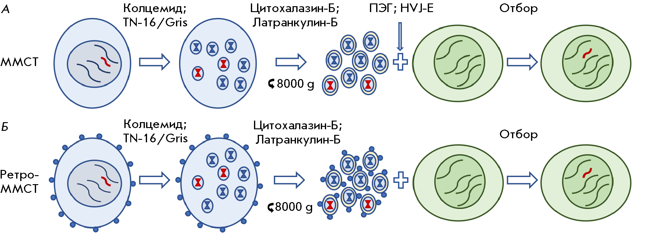 Рис. 6. Методы переноса ИХЧ из донорских клеток в реципиентные с помощью метода ММСТ. Донорские клетки изображены голубыми овалами, а реципиентные – зелеными овалами. ИХЧ обозначена красным цветом. А – оригинальный метод ММСТ. На первом этапе клетки обрабатывают колцемидом или цитостатиками TN-16 и гризеофульвином (Gris) для образования метафазных микроядер. После обработки цитохалазином-Б или латранкулином-Б собирают фракцию микроклеток с помощью центрифугирования и фильтрования. Микроклетки сливают с клетками-реципиентами с использованием ПЭГ или оболочек вируса HVJ-E. Клетки, содержащие ИХЧ, отбирают на селективной среде. Б – метод ретро-ММСТ, в котором клетки-доноры предварительно трансдуцируют лентивирусами, кодирующими белок MLV (показан синими кружками на поверхности донорских клеток)