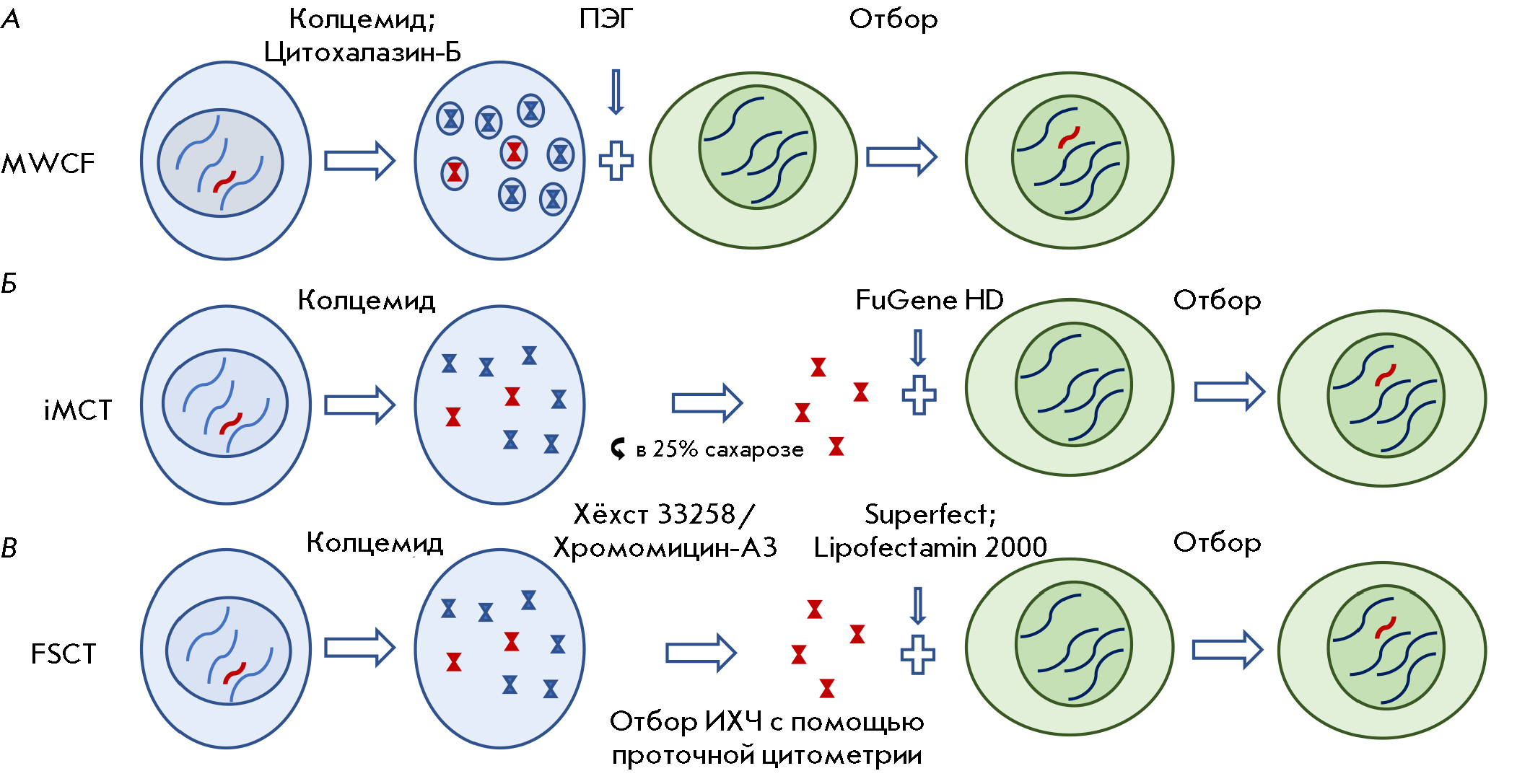 Рис. 7. Методы переноса ИХЧ без использования микроклеток. А – метод MWCF – слияние донорских клеток с клетками-реципиентами. Б – метод iMCT – трансфекция изолированных хромосом в целевые клетки с помощью липофекции. После обработки колцемидом донорские клетки лизируют и выделенные на градиенте сахарозы ИХЧ переносят в клетки-реципиенты с помощью реактива FuGene HD. В – в методе FSCT окрашенные Хёхст 33258 и хромомицином-А3 ИХЧ обогащают с помощью проточной цитофлуориметрии и трансфицируют в клетки-мишени с помощью липофекции
