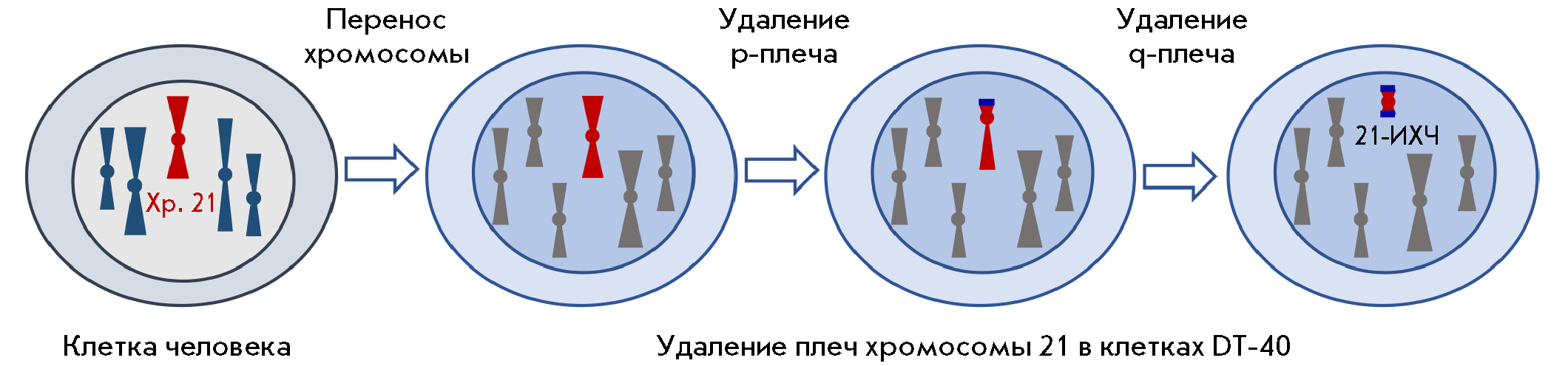 2. Рис. 1. Схема сборки 21-ИХЧ с помощью метода теломер-ассоциированной фрагментации хромосом. Хромосому 21 из клеток человека переносили в клетки линии DT-40. Затем с помощью гомологичной рекомбинации вблизи центромеры в нее встраивали теломерные последовательности (отмечены синим), что приводило к фрагментации хромосомы в районе вставки. Таким образом, в результате последовательного удаления плеч хромосомы с их заменой на теломерные участки получали 21-ИХЧ (21HAC)