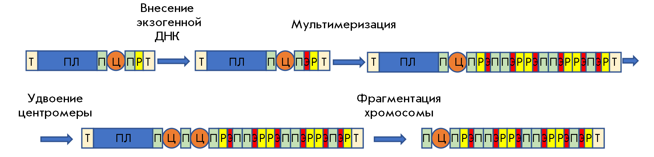 3. Рис. 2. Схема получения ИХЧ типа SATAC. В перицентромерную область акроцентрической хромосомы с помощью гомологичной рекомбинации вносят экзогенную ДНК, содержащую сайты для сайт-специфической рекомбинации, селективный маркер и другие последовательности. Вследствие такого встраивания происходит амплификация участков перицентромерной, рибосомной и экзогенной ДНК. После удвоения центромеры происходит фрагментация хромосомы, в результате чего формируется ИХЧ. Условные обозначения: Т – теломера, ПЛ – длинное плечо акроцентрической хромосомы, П – перицентромерный участок, Ц – центромера, Р – рибосомная ДНК, Э – экзогенная ДНК