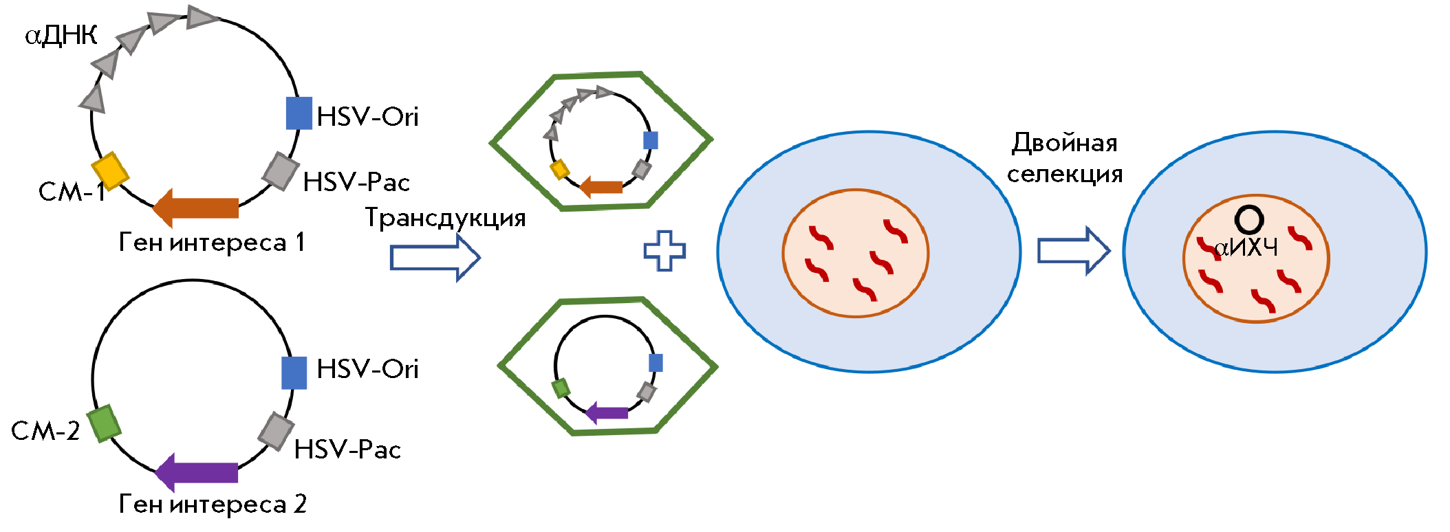Рис. 5. Схема сборки ИХЧ с помощью ампликонов HSV-1. На основе ампликонов вируса простого герпеса (HSV-1) сконструированы два вектора, один из которых содержал вирусные сигналы – ориджин репликации (Ori), сигнал упаковки в вирусный капсид (Pac), селективные маркеры (СМ-1 и 2) и целевые гены. Второй вектор содержал последовательность длиной 120 т.п.н., состоящую из альфа-сателлитных повторов 17-й хромосомы человека (αДНК). Полученными вирусами совместно трансдуцировали клетки-мишени. В ходе двойной селекции отбирали клетки, в которых в результате рекомбинации происходит объединение двух векторных конструкций с образованием целевой альфоидной ИХЧ (αИХЧ)
