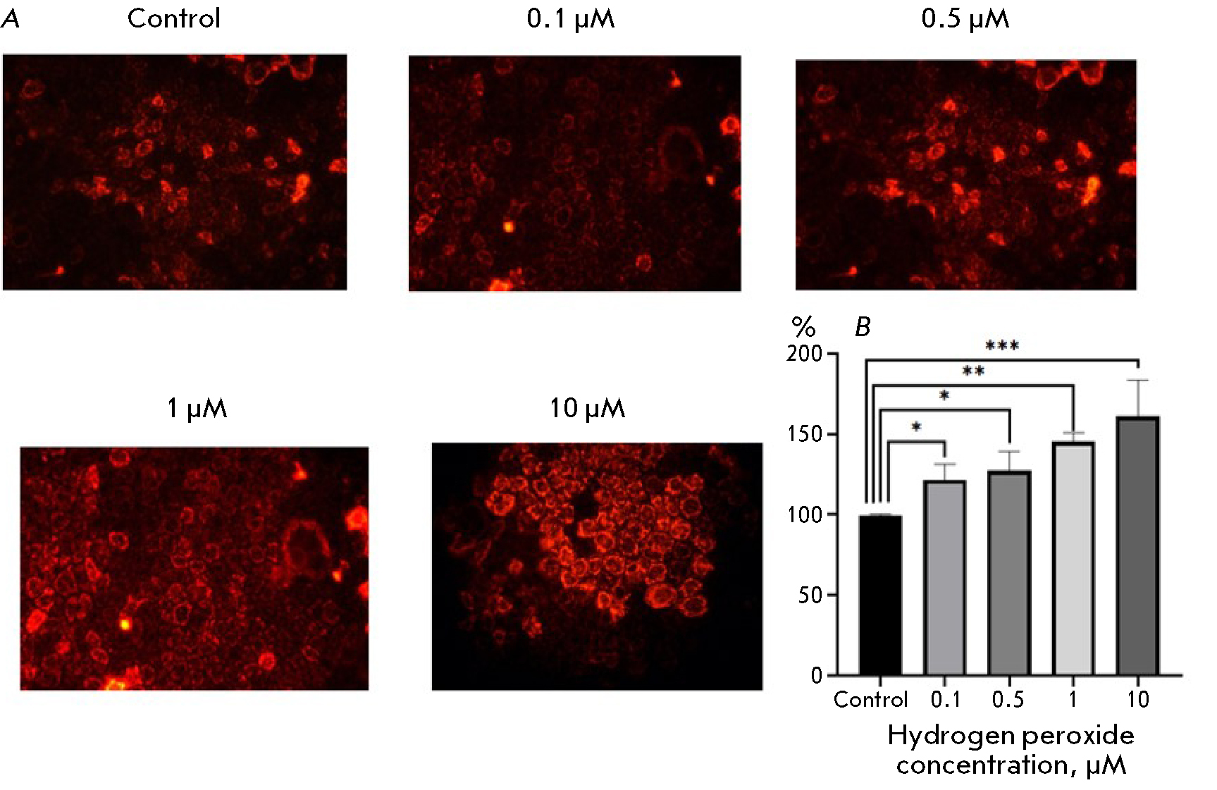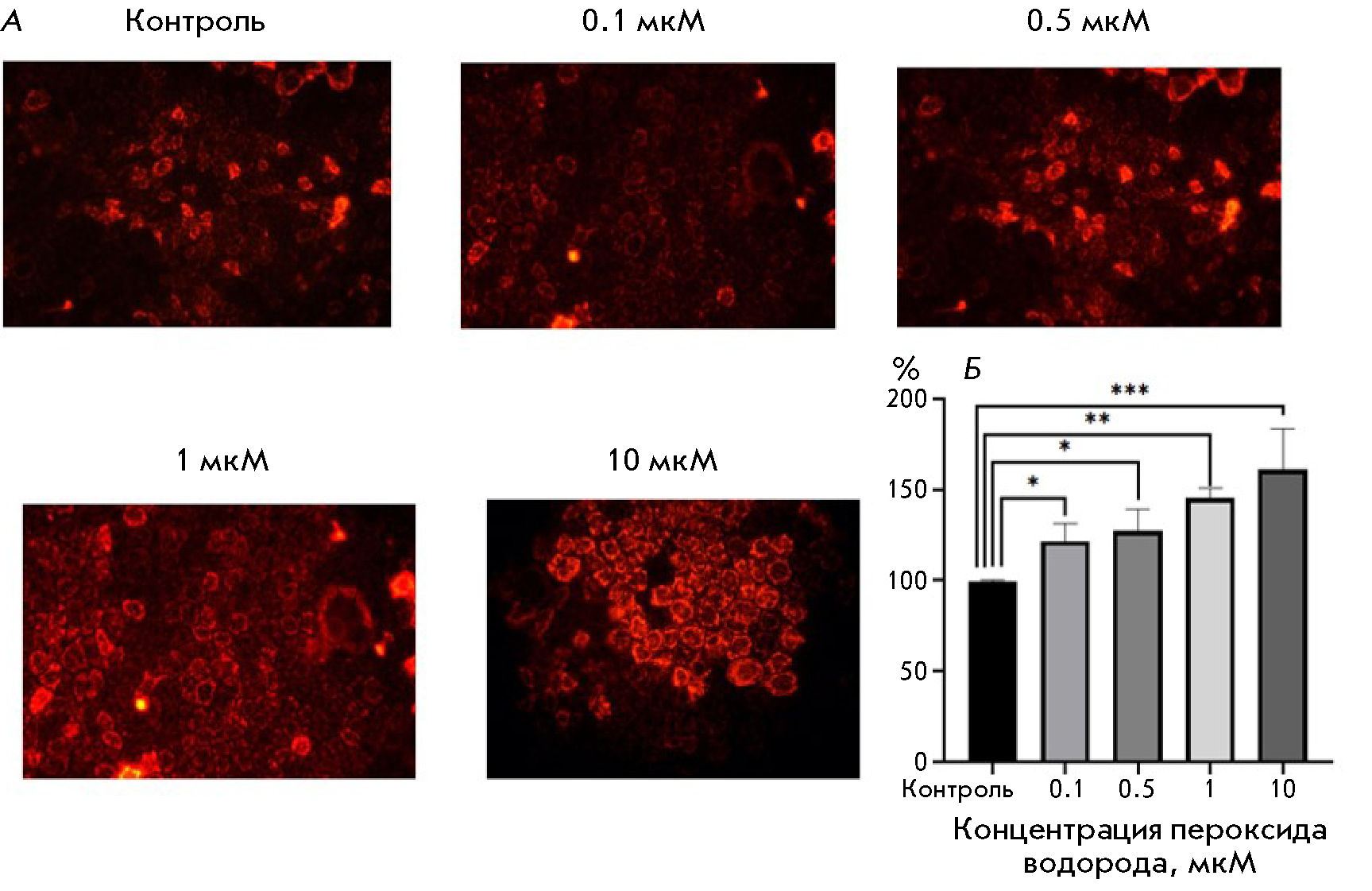 Рис. 1. Изменение уровня АФК под действием пероксида водорода (Н2О2) в клетках линии Сасо-2. А – окрашивание с помощью MitoTracker Red CM-H2 XRos, увеличение ×400 раз. Б – интенсивность флуоресценции в лизате клеток. *р ≤ 0.05; **р < 0.01; ***р ≤ 0.001 по сравнению с контролем (тест Даннетта)
