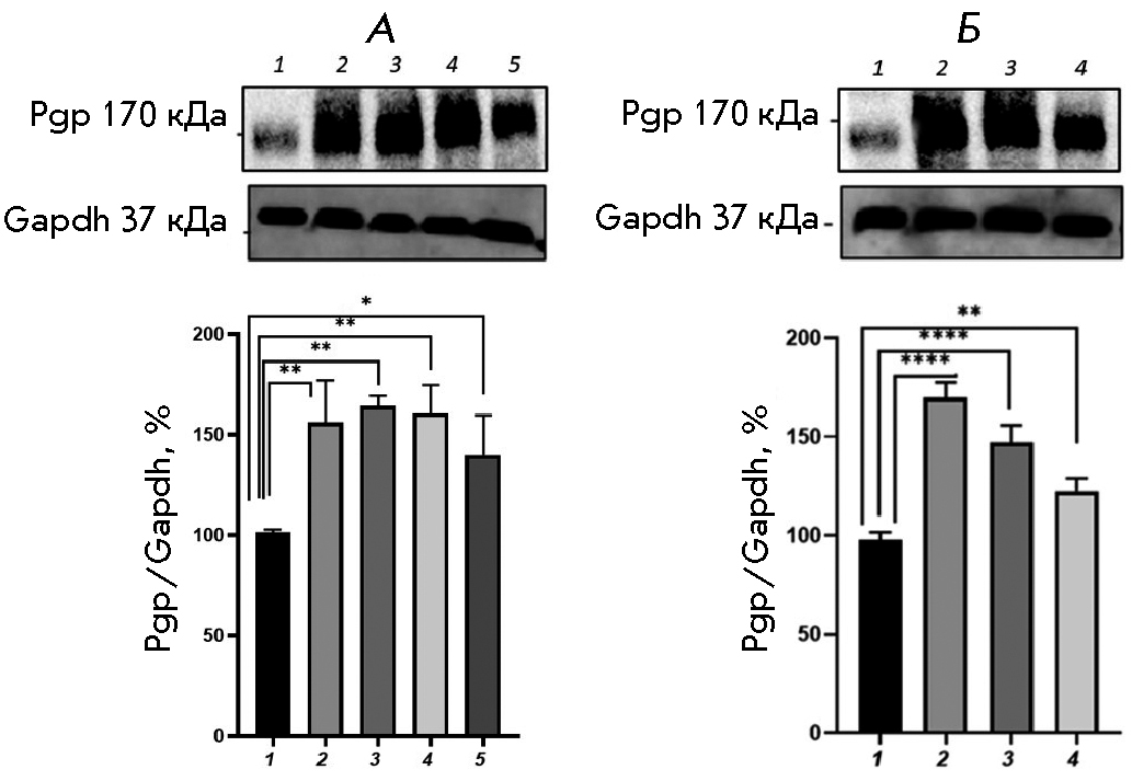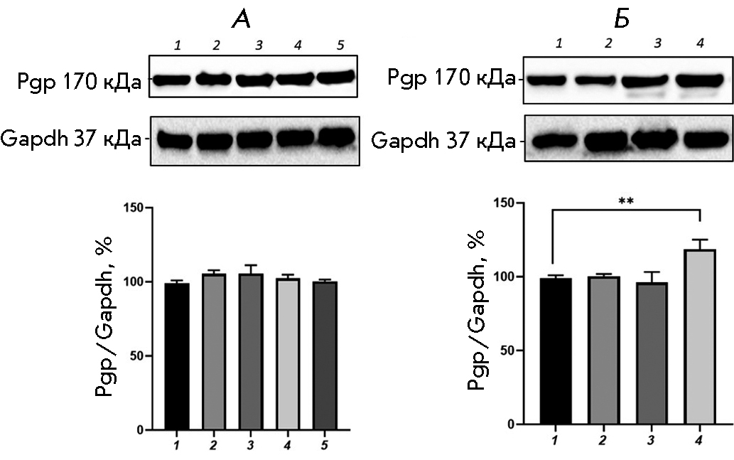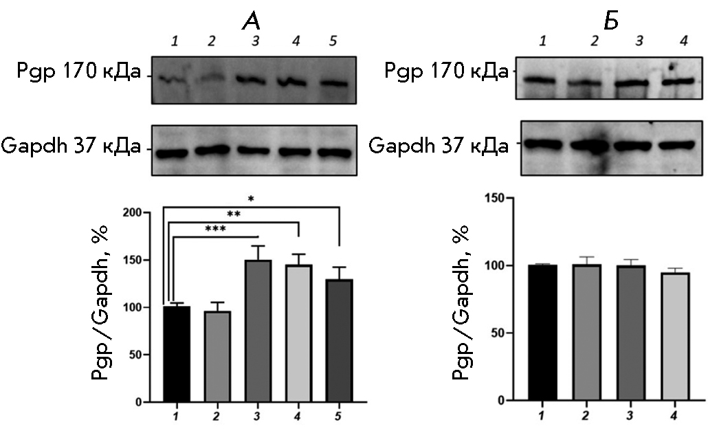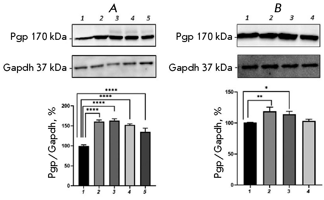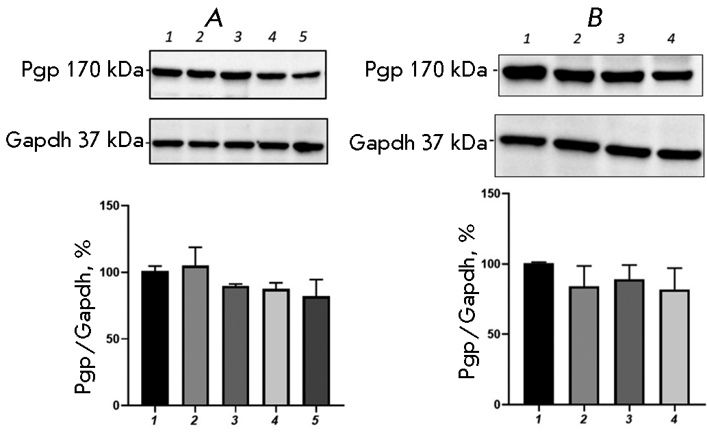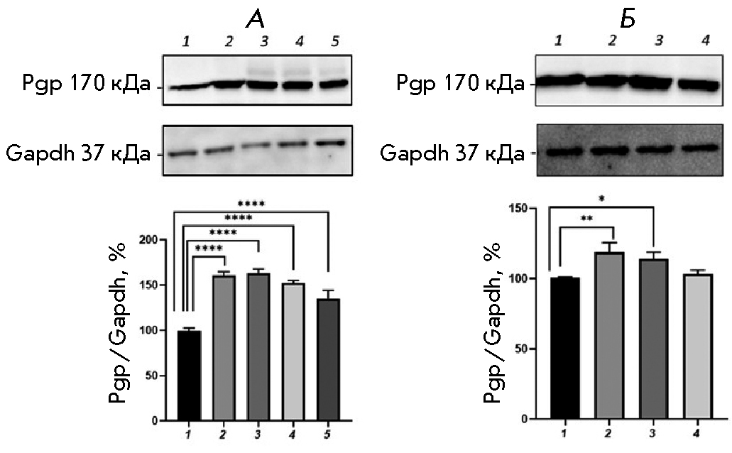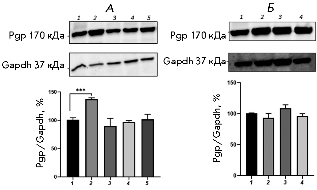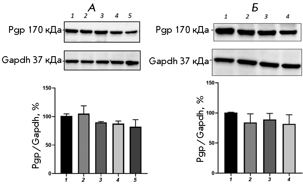 Белок Pgp детектировали с использованием первичных моноклональных антител мыши (P-Glycoprotein Antibody MA5-13854, Invitrogen) в концентрации 1:200 в блокирующем растворе Casein bloсker (BioRad) в течение 2 ч при 37°C. Первичные антитела визуализировали с использованием вторичных антител кролика (Rabbit-anti-Mouse IgG (H+L) Secondary Antibody, HRP, Invitrogen) в разведении 1:4000 и инкубации в течение 1 ч при комнатной температуре. Хемилюминесценцию фиксировали с использованием ChemiDocXRS+ (BioRad). Интенсивность полос определяли денситометрически с помощью программного обеспечения ImageLab (BioRad).