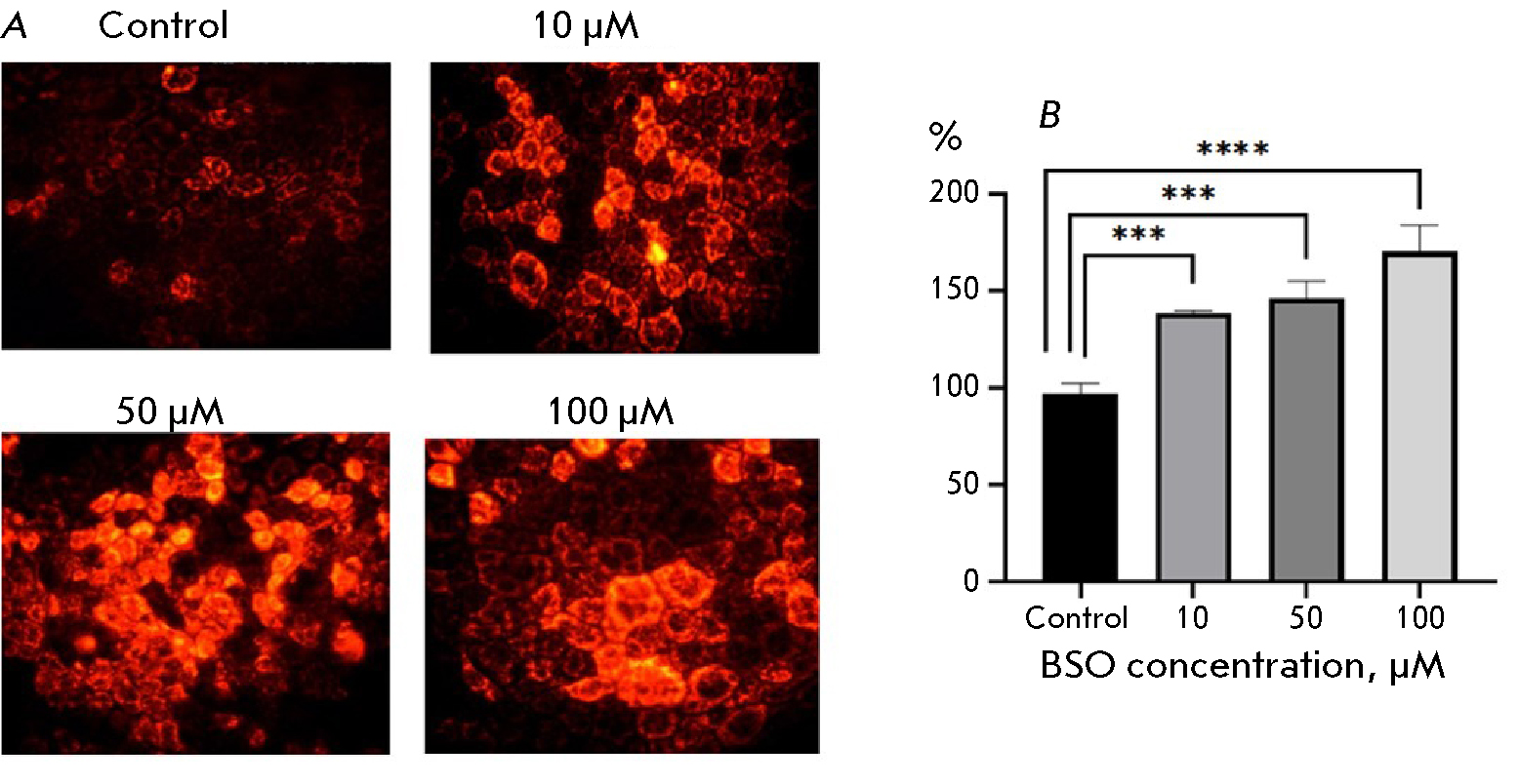 Эндогенный ОС воспроизводили с помощью ингибитора синтеза глутатиона – DL-бутионинсульфоксимина (БСО, ингибитор γ-глутамилцистеин-синтетазы) [20] в конечной концентрации 10, 50 и 100 мкМ в питательной среде (5–50 × 10-15 моль/клетка).