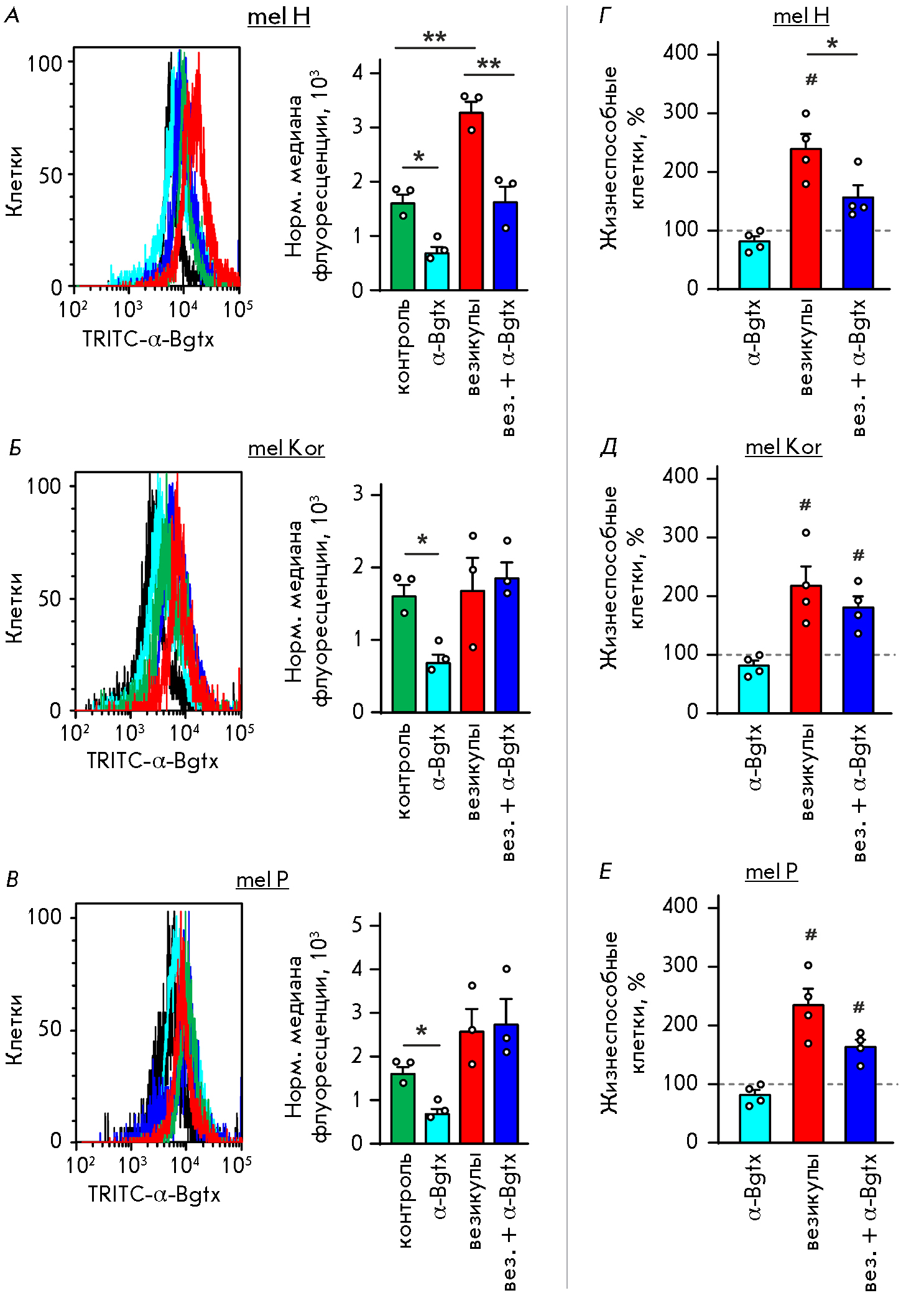 Fig. 2. Analysis of the effects of extracellular vesicles secreted by metastatic melanoma cells and α-Bgtx on the α7-nAChR expression and keratinocyte proliferation. А–C – Expression of α7-nAChR on the surface of normal keratinocytes incubated in the presence of extracellular vesicles derived from mel H (A), mel Kor (B), and mel P (C) cells and/or α-Bgtx. The data are presented as normalized median fluorescence (MFI) ± SEM (n = 3). * (p < 0.05) and ** (р < 0.01) indicate a significant difference between the data groups according to one-way ANOVA, followed by the Tukey’s post hoc test. D–F – The effects of extracellular vesicles derived from mel H (D), mel Kor (E), and mel P (F) cells and/or α-Bgtx on the proliferation of normal keratinocytes. The data are % of untreated cells ± SEM (n = 4). # (р < 0.05) indicates a significant difference from the untreated cells according to the one-sample t-test. * (p < 0.05) indicates a significant difference between the data groups according to one-way ANOVA, followed by the Tukey post hoc test