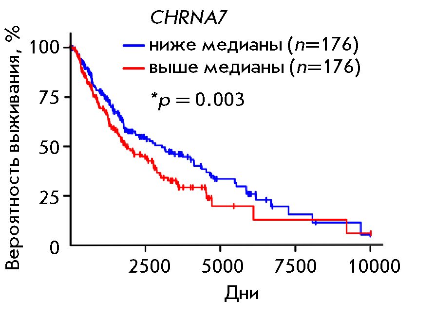 Fig. 3. Bioinformatic analysis of the correlation between the survival of patients with metastatic melanoma and the CHRNA7 expression level. Patients were divided into two groups with the gene expression levels above and below the median value. Statistical analysis of patient survival was performed by the Kaplan–Meier method using the log-rank test
