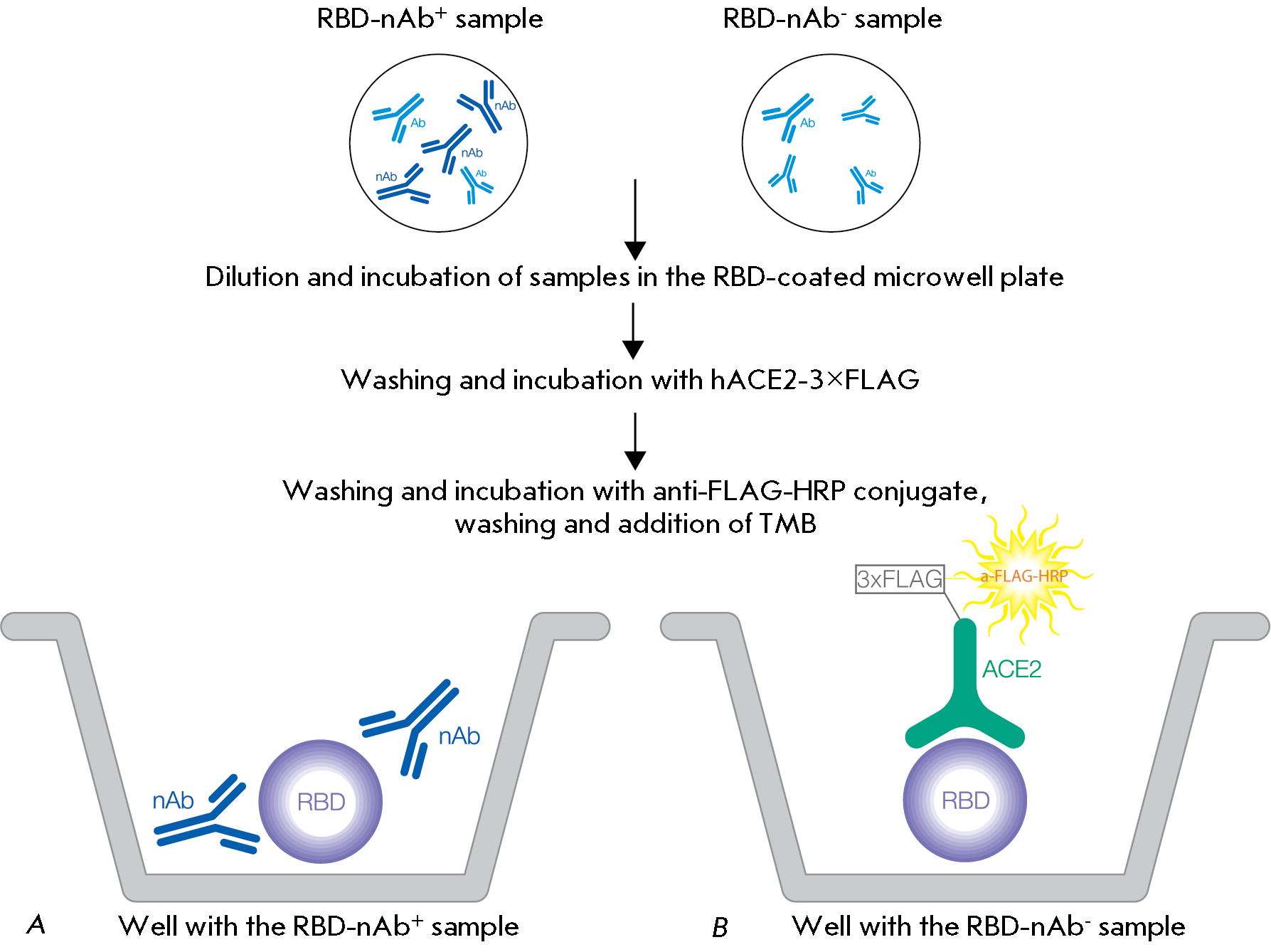 Fig. 1. Scheme of the quantitative determination of the activity of SARS-CoV-2 RBD-specific neutralizing antibodies in serum or plasma (sVNT). Antibodies in the serum sample interact with the recombinant RBD adsorbed in the wells. If the sample contains RBD-neutralizing antibodies (A), they block the binding of RBD to ACE2. If the sample does not contain neutralizing antibodies (B), the RBD adsorbed on the plate binds to recombinant ACE2. This binding is detected by peroxidase-labeled antibodies against the 3×FLAG sequence (3×FLAG) contained in recombinant ACE2. Therefore, the colorimetric signal recorded in the assay is inversely proportional to the concentration of the neutralizing antibodies in the sample. Designations: Ab – antibodies without neutralizing activity; ACE2 – recombinant human ACE2 receptor; HRP – antibodies to the FLAG epitope labeled with horseradish peroxidase; nAB – antibodies with RBD-neutralizing activity; RBD – the recombinant receptor-binding domain of the coronavirus SARS-CoV-2 S protein