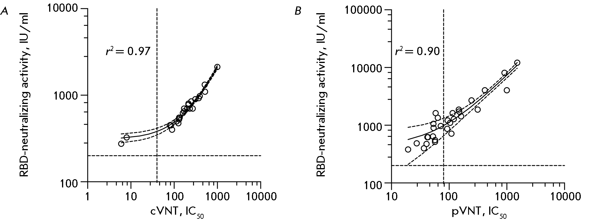 We have performed a successful validation of the designed competitive ELISA kit by comparing the RBD-neutralizing activity data to the virus neutralization data obtained using both standard testing with “live” viruses (cVNT) and testing with pseudoviruses (pVNT). The fidelity parameters of linear approximation (r2) were 0.97 and 0.90, respectively (Fig. 2).