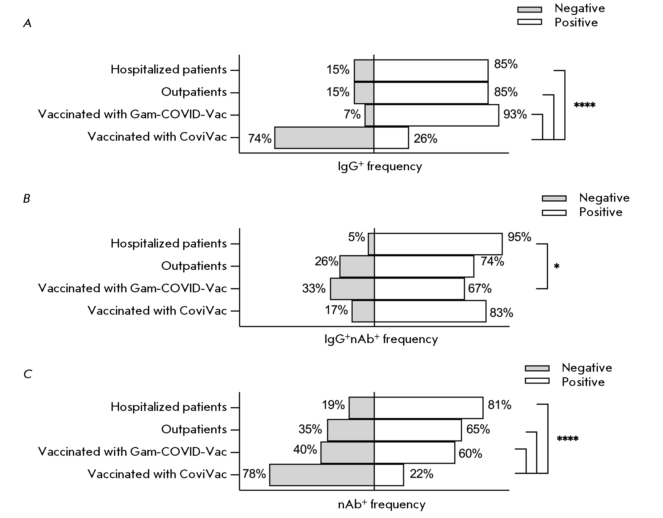 The frequency of occurrence of IgG-positive sera samples among the groups Hospitalized patients, Outpatients, and Vaccinated with Gam-COVID-Vac varied from 85 to 93%. In the group Vaccinated with CoviVac, the frequency of occurrence was as low as 26% (Fig. 3A). Among these IgG-seropositive sera samples, the frequency of occurrence of RBD-nAb-positive serum samples varied from 67 to 95% (Fig. 3B). The frequency of occurrence of RBD-nAb-positive serum samples in the group (showing the protective properties of the serum samples in the group) varied from 22 to 81% (Fig. 3C).