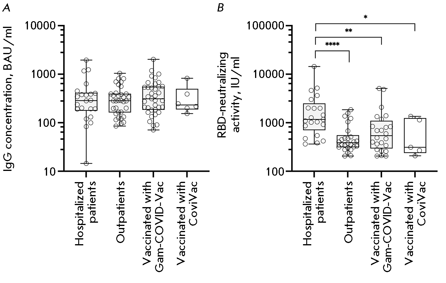The concentrations of SARS-CoV-2 RBD-specific IgG in the seropositive samples in different groups varied insignificantly (Fig. 4A). However, although the concentrations of RBD-specific IgG in the seropositive samples were almost identical for all the groups, the activity of RBD-specific virus-neutralizing antibodies was substantially higher in the group Hospitalized patients compared to those in the other groups (Fig. 4B).