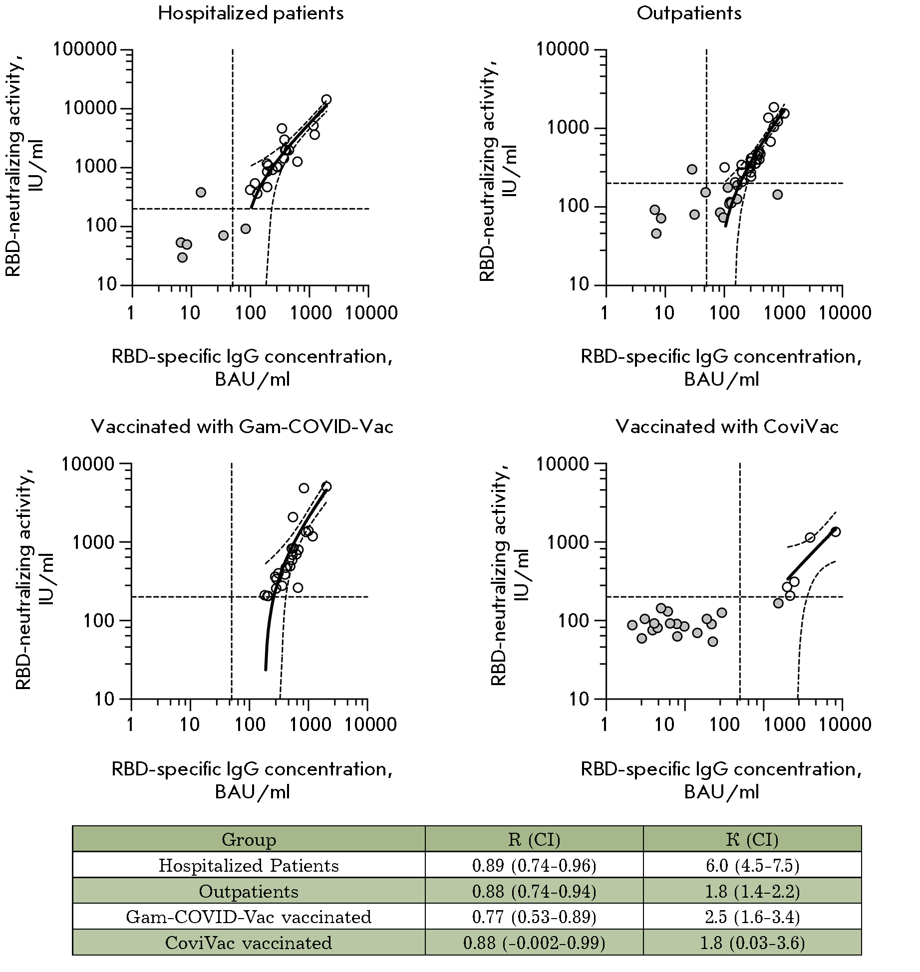 Fig. 6. Linear regression analysis of the serum antibody RBD-ACE2 neutralizing activity and RBD-specific IgG concentration. Double seropositive (RBD-IgG+ and RBD-nAb+) serum samples are shown as white circles; negative samples are shown as gray circles. The 95% confidence intervals and activity and concentration thresholds are shown with dotted lines. R is the Pearson correlation coefficient; K is the slope of the regression line; CI is the 95% confidence interval