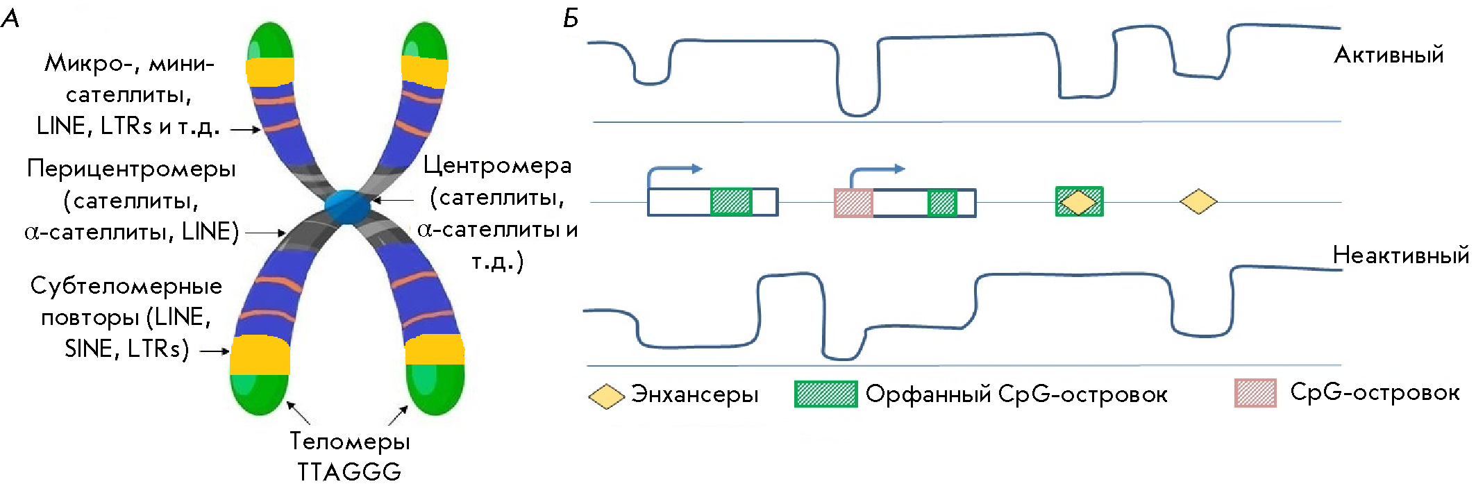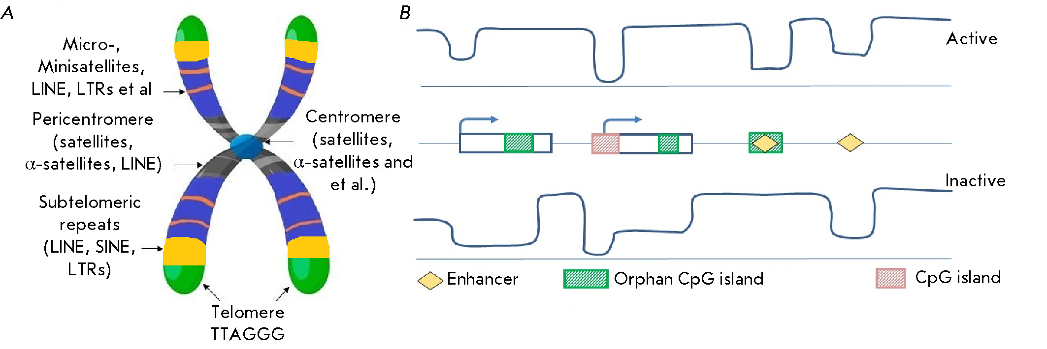 Около 90% всех метилированных CpG в геноме млекопитающих находятся в различных повторяющихся последовательностях, таких, как сателлитные повторы и мобильные элементы [14]. Наибольшее количество CpG-богатых повторяющихся элементов расположено в структурных областях хромосом: центромерных, околоцентромерных и субтеломерных (рис. 2А). Нанопоровое полногеномное секвенирование генома человека позволило не только прочитать последовательности повторяющихся элементов, но и провести анализ их метилирования в геноме: в норме они в значительной степени метилированы [2, 15]. Отметим, что метилирование дуплицированных/повторяющихся последовательностей, находящихся на разных хромосомных участках, может сильно отличаться [2], то есть для установления определенного профиля метилирования повторяющихся последовательностей важна не только сама последовательность, но и ее хромосомное окружение. Гипометилирование различных повторяющихся элементов характерно для различных патологических состояний, включая онкотрансформацию клеток, иммунодефицитные состояния, аутоиммунные, неврологические и психиатрические заболевания [7–9, 16, 17]. Необходимость метилирования сателлитных повторов в центромерных и околоцентромерных областях связывают с правильным расхождением хромосом при репликации [18]. Метилирование же мобильных элементов, транспозонов, ретротранспозонов направлено на подавление их транскрипции. Деметилирование этих повторов приводит к их активной транскрипции, транспозиции, что влияет на возникновение нестабильности генома. Возможно, этот механизм избыточен, так как для эволюционно ранних транспозонов, ретротранспозонов, характерно наличие мутаций или делеций в последовательностях, кодирующих транспозазу, что приводит к образованию неактивной формы белка.