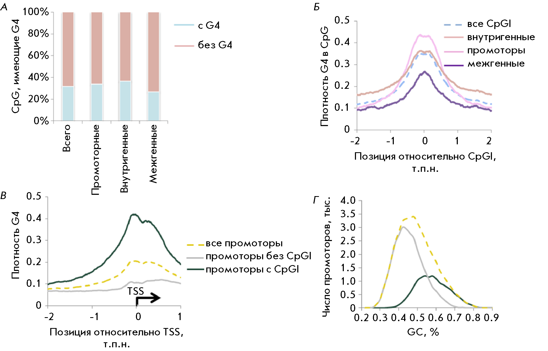 Рис. 4. Анализ распределения потенциальных G4-последовательностей в CpG-островках. А – доля СpG-островков с G4; Б – плотность распределения G4 в окрестностях CpG-островков в зависимости от локализации в геноме; В – плотность G4 и Г – GC-состав в промоторных участках в зависимости от наличия CpG-островков