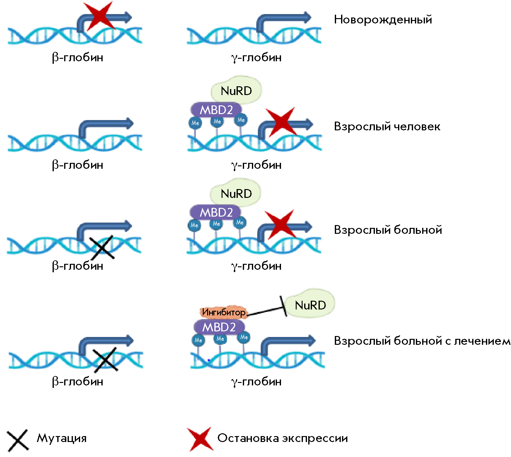 Рис. 5. Модель функционального значения взаимодействия белка MBD2 и репрессионного комплекса NuRD в регуляции гена гамма-глобина при бета-телассемии [122, 123]