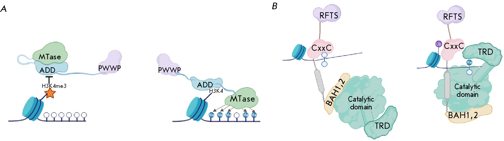 Fig. 3. Binding scheme (A) DNMT3a/3b to unmodified H3K4, the presence of H3K4me3 prevents the ADD domain from binding to DNA, which leads to autoinhibition of the enzyme; (B) DNMT1 to DNA, the interaction with unmethylated DNA leads to inhibition of the catalytic domain [29, 30]