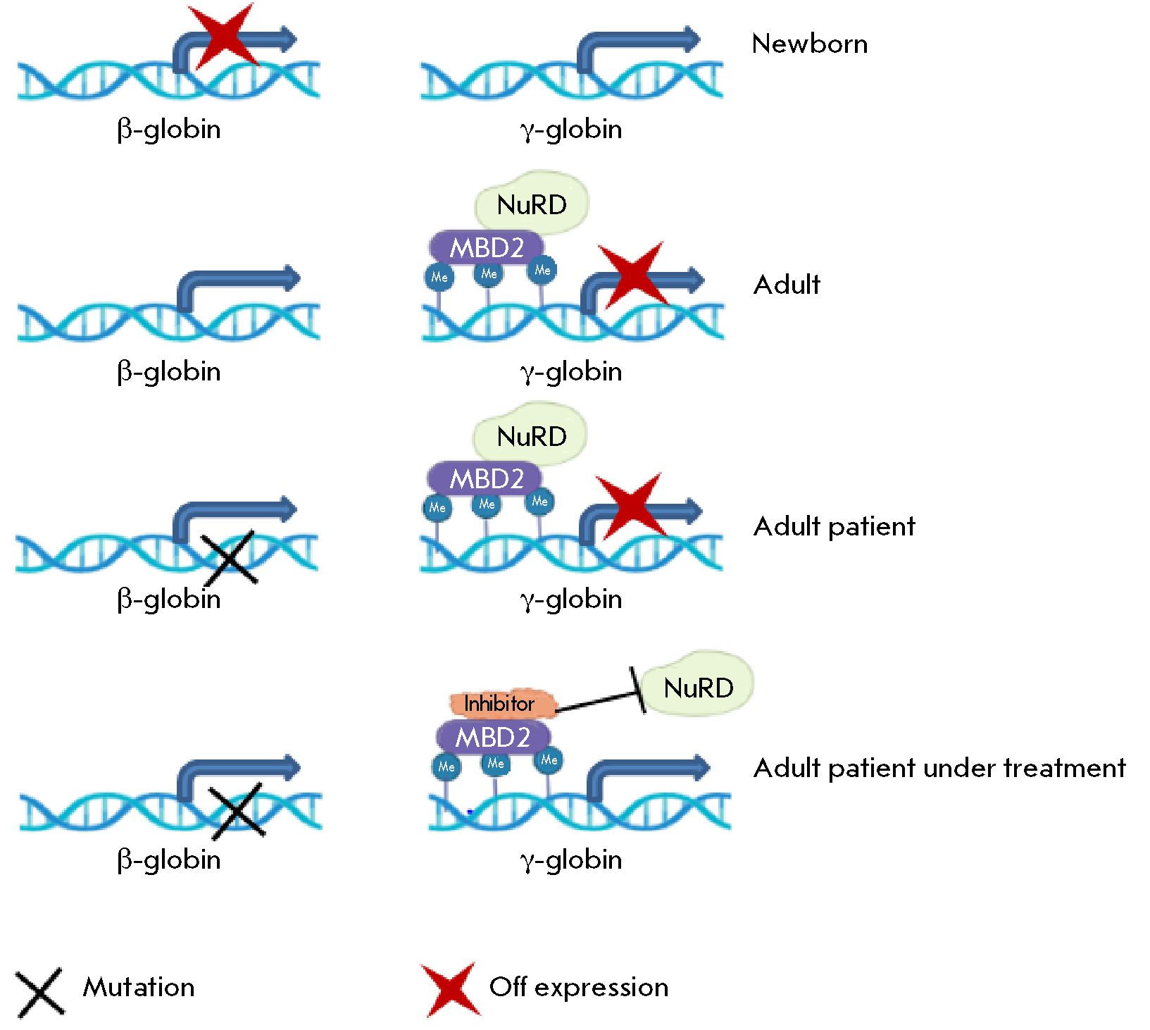 Fig. 5. Model of the functional significance of the interaction between the MBD2 protein and the NuRD repression complex in the regulation of the gamma globin gene in beta-telassemia [122, 123]